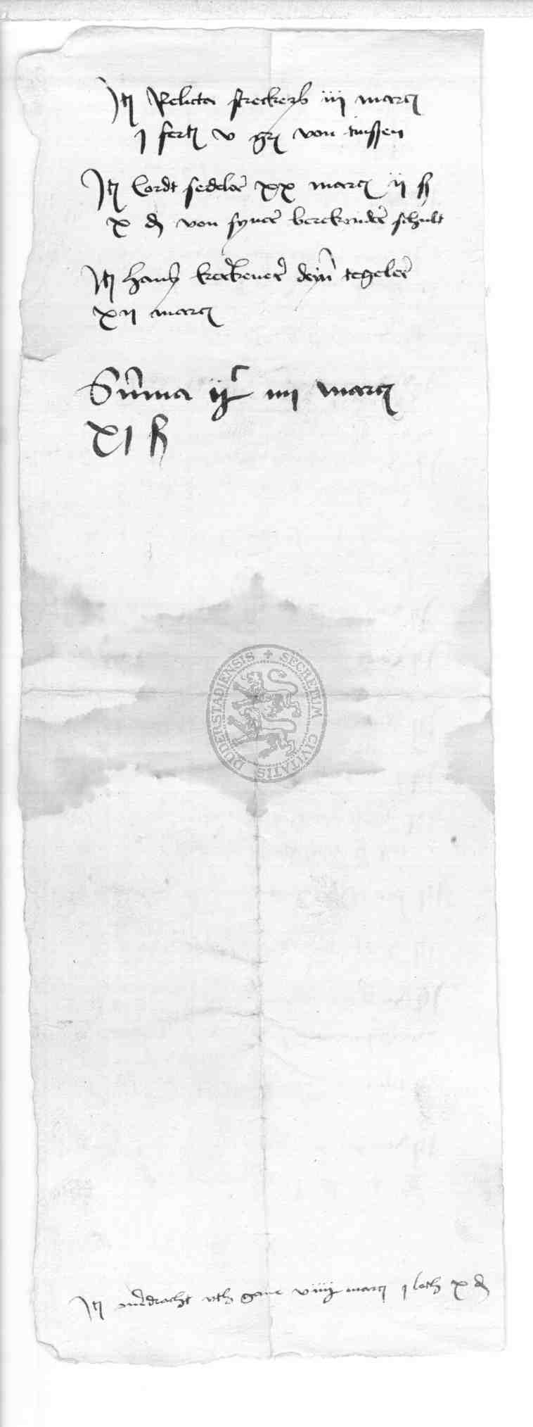 | Rubrum: | deme unse heren noch schuldich synt von berekenderer schult von haveren unde beere unde smedewarck unde doch reyde an uth gave geschreven ist unde doch nicht uth gegeven [Fortsetzung] |