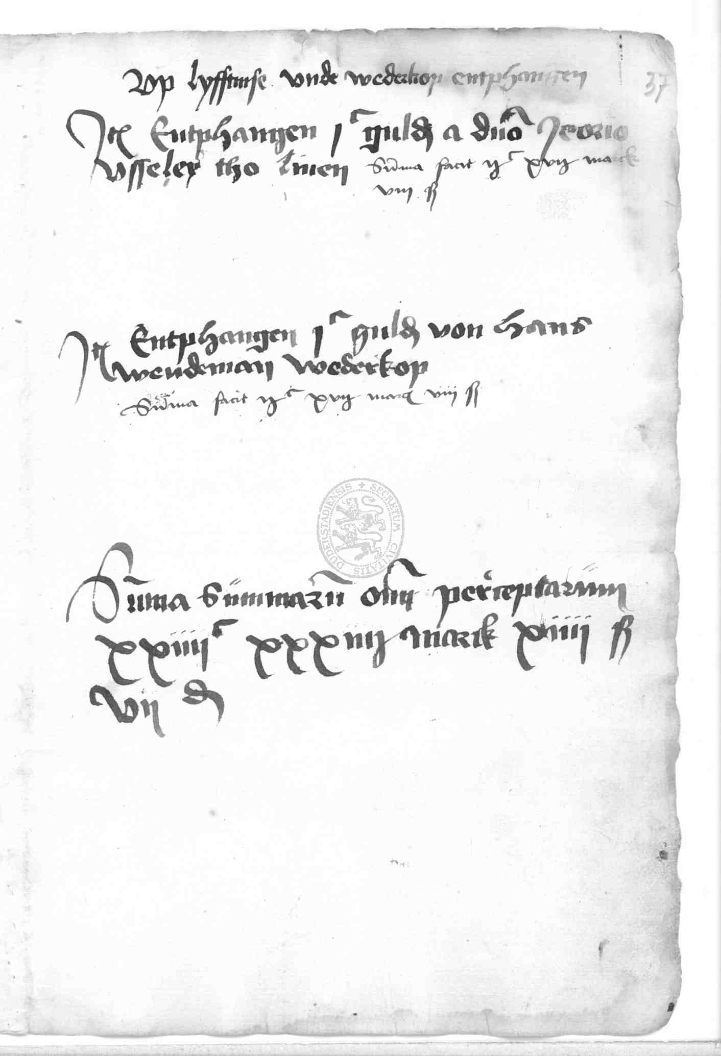 | Rubrum: | item entphangen 100fl a domino Jeorio Usseler tho linen |
