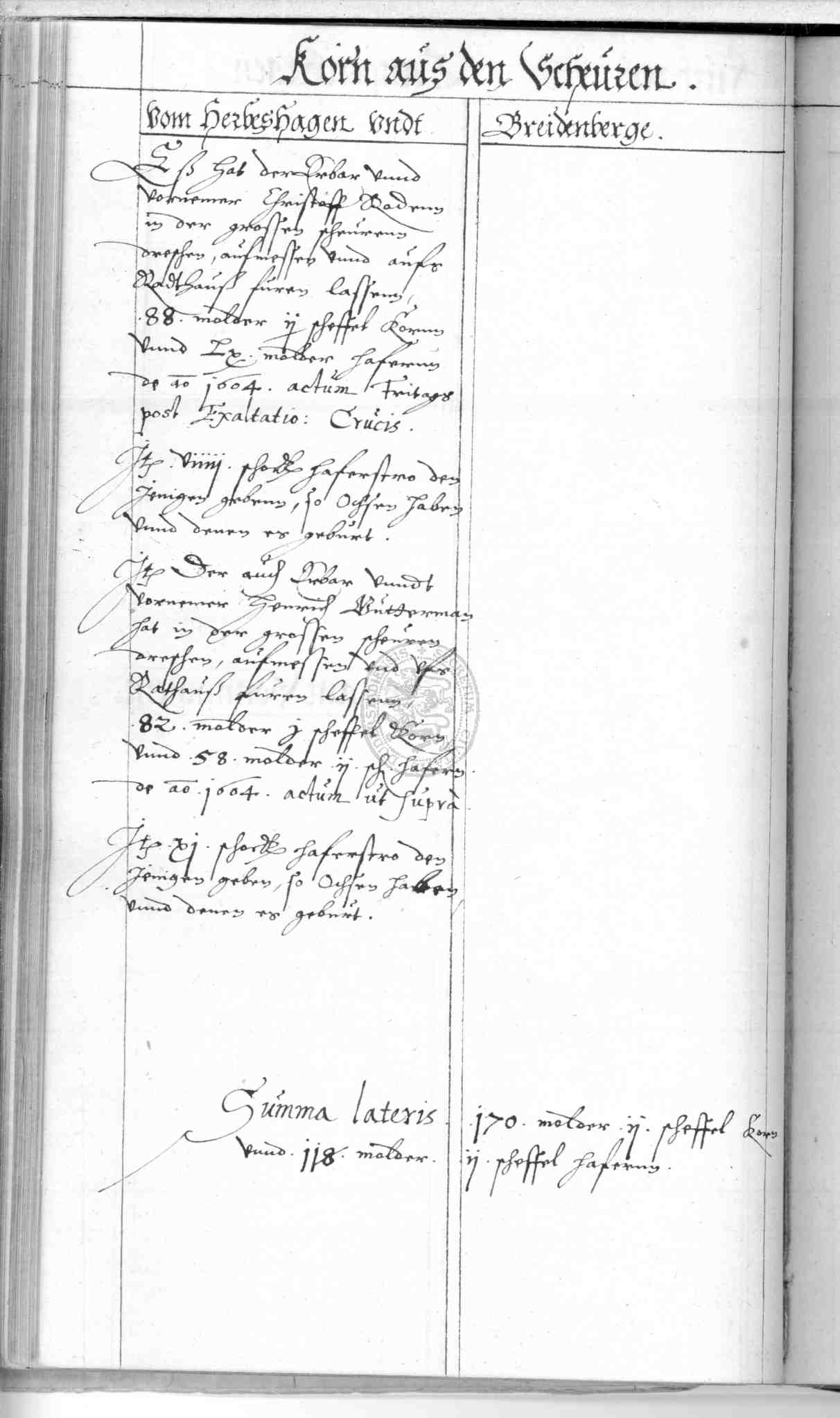 | Rubrum: | korn aus den scheuren vom Herbeshagen und Breidenberge |