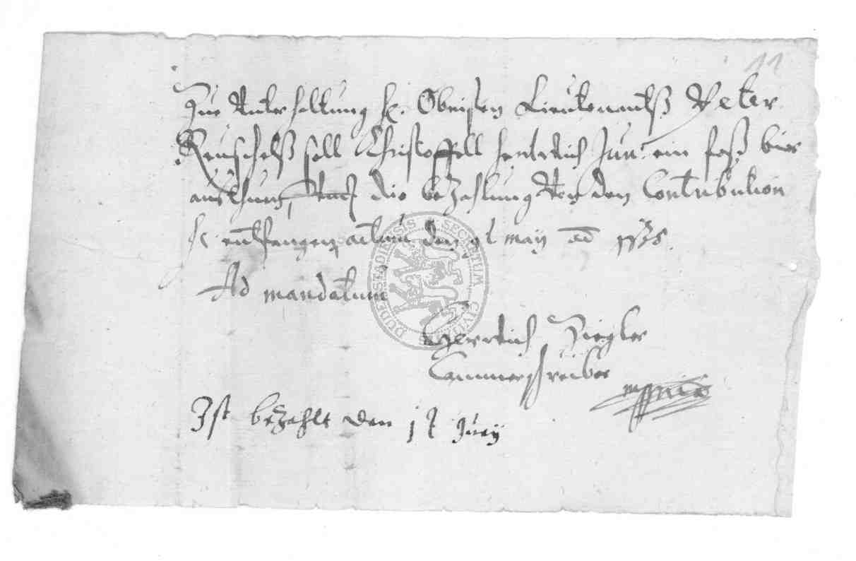 | Titel: | Quittungen über geleistete Kontribution, Leistung von Aufwandsentschädigung und Bescheinigungen über Kürzung der Kontribution, desgleichen Belege über Zahlung von Stabs- und Sevisgeldern sowie Weimarischer Accordgelder |