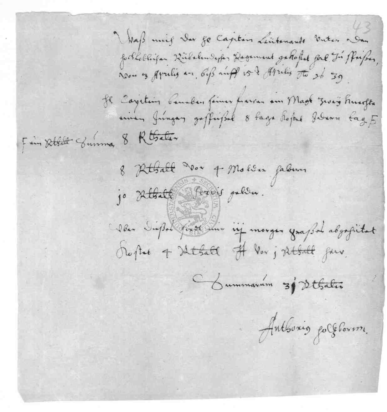 | Titel: | Kosten der Einquartierung und Verpflegung des Rubländischen Regiments |