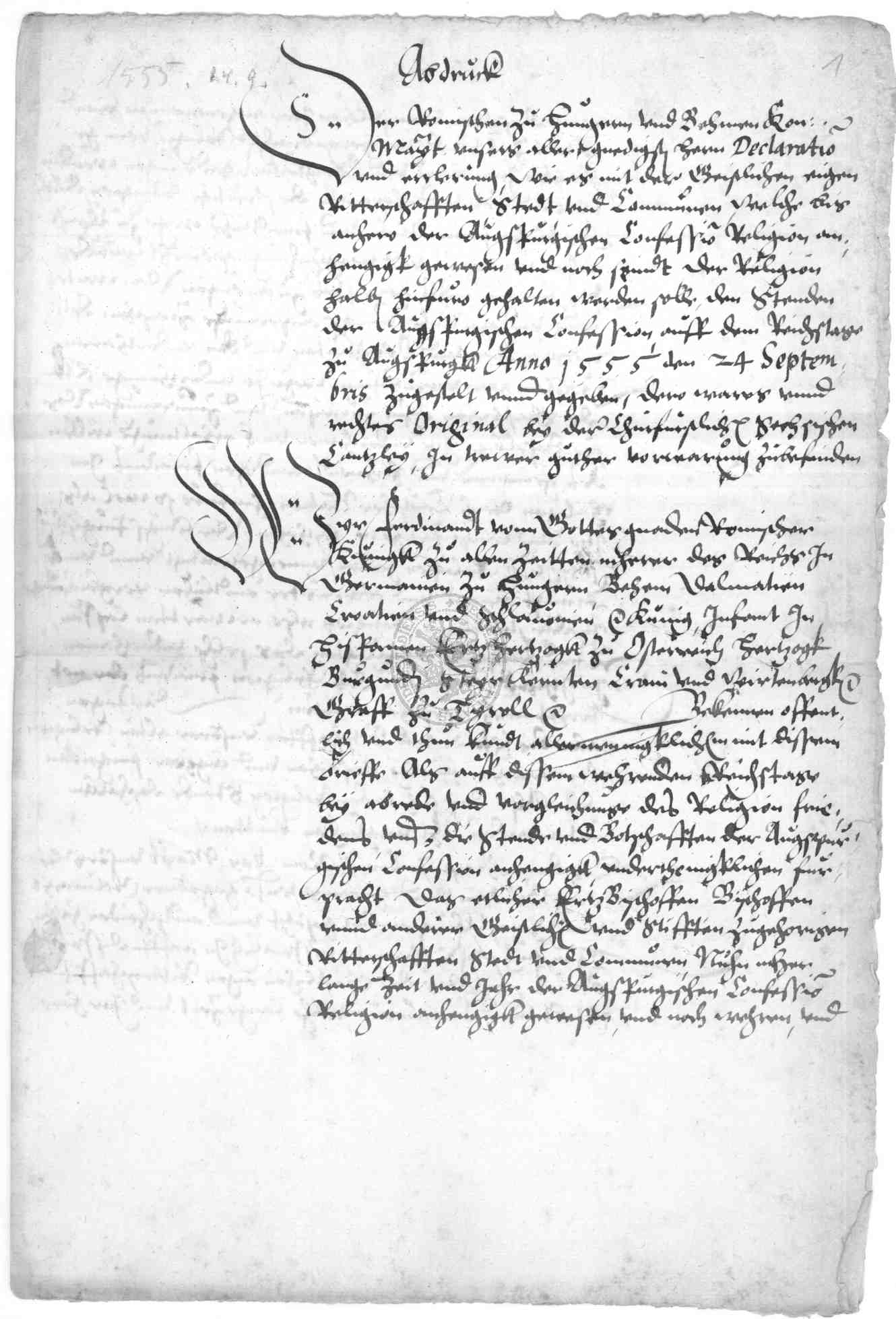 | Titel: | Copia des Abdrucks, den Religionsfrieden belangend, der den der Augsburgischen Konfession anhängigen Ständen auf dem Reichstag zu Augsburg anno 1555, den 24. September mitgeteilt |
