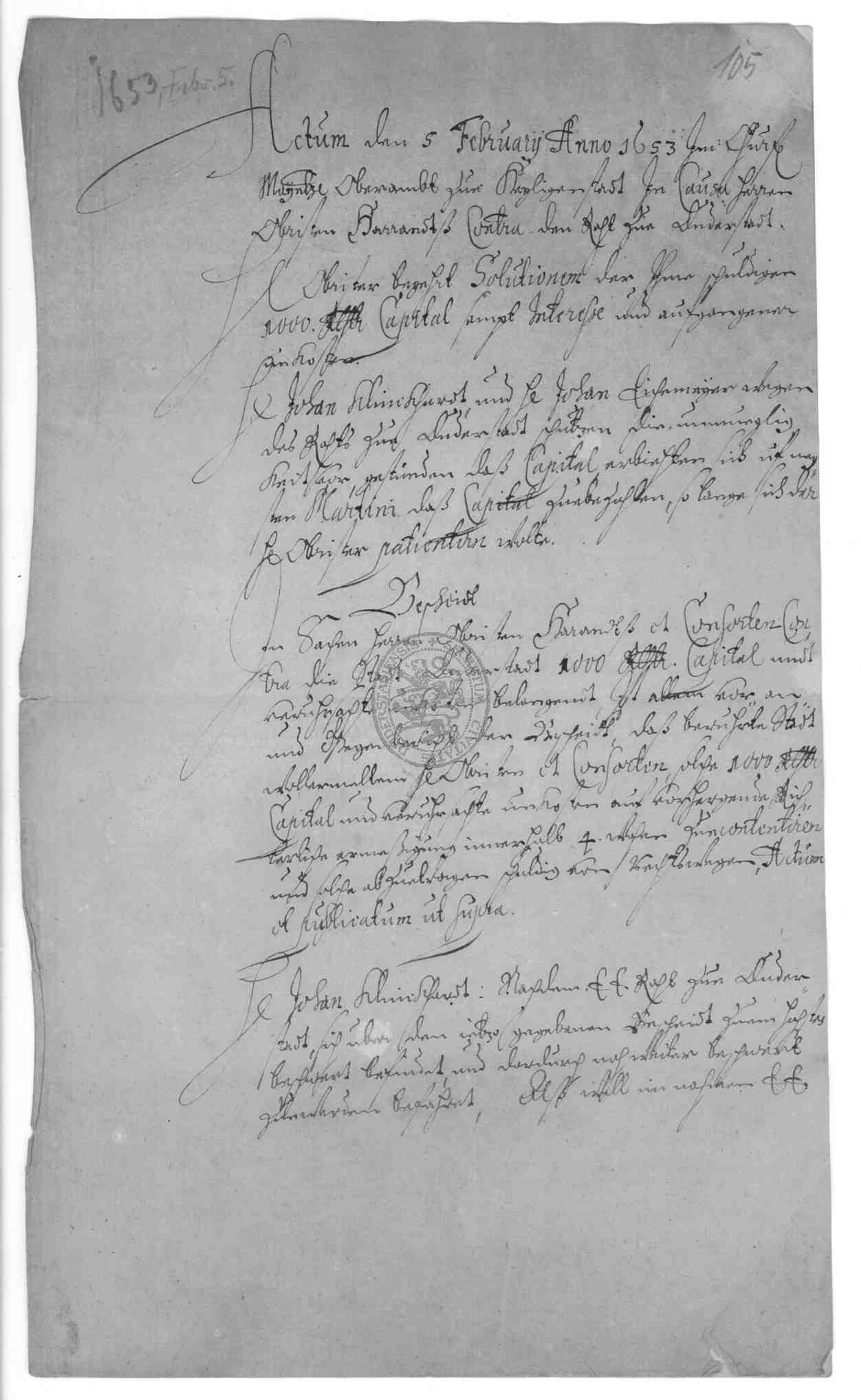| Titel: | Kapitalschuld des Rats zu Duderstadt gegenüber Viet Gabriel Hoffmann, dem Oberst Wilhelm Harandt sowie dem Freiherrn von Pohlschwitz und Weseritz |