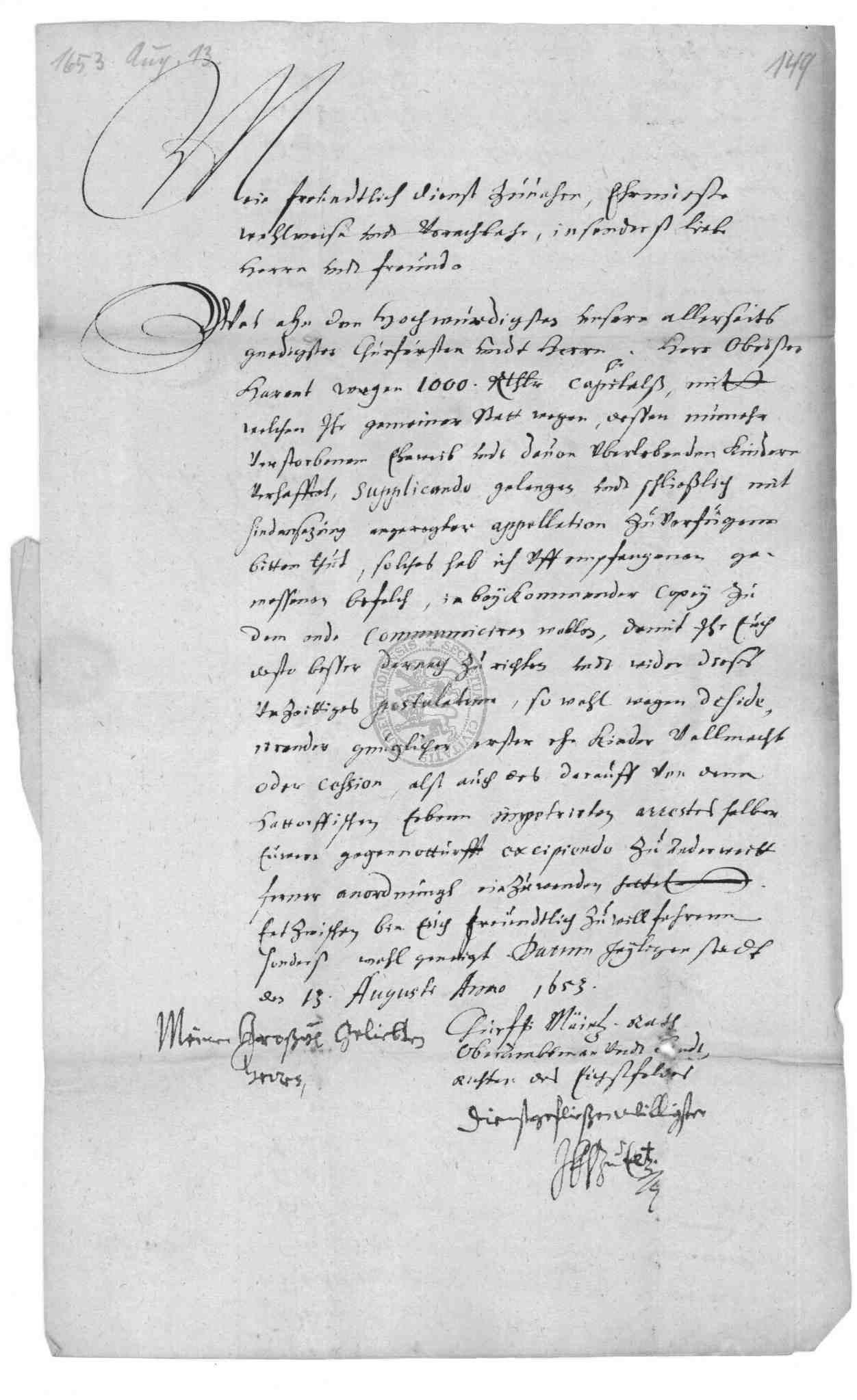 | Titel: | Kapitalschuld des Rats zu Duderstadt gegenüber Viet Gabriel Hoffmann, dem Oberst Wilhelm Harandt sowie dem Freiherrn von Pohlschwitz und Weseritz |