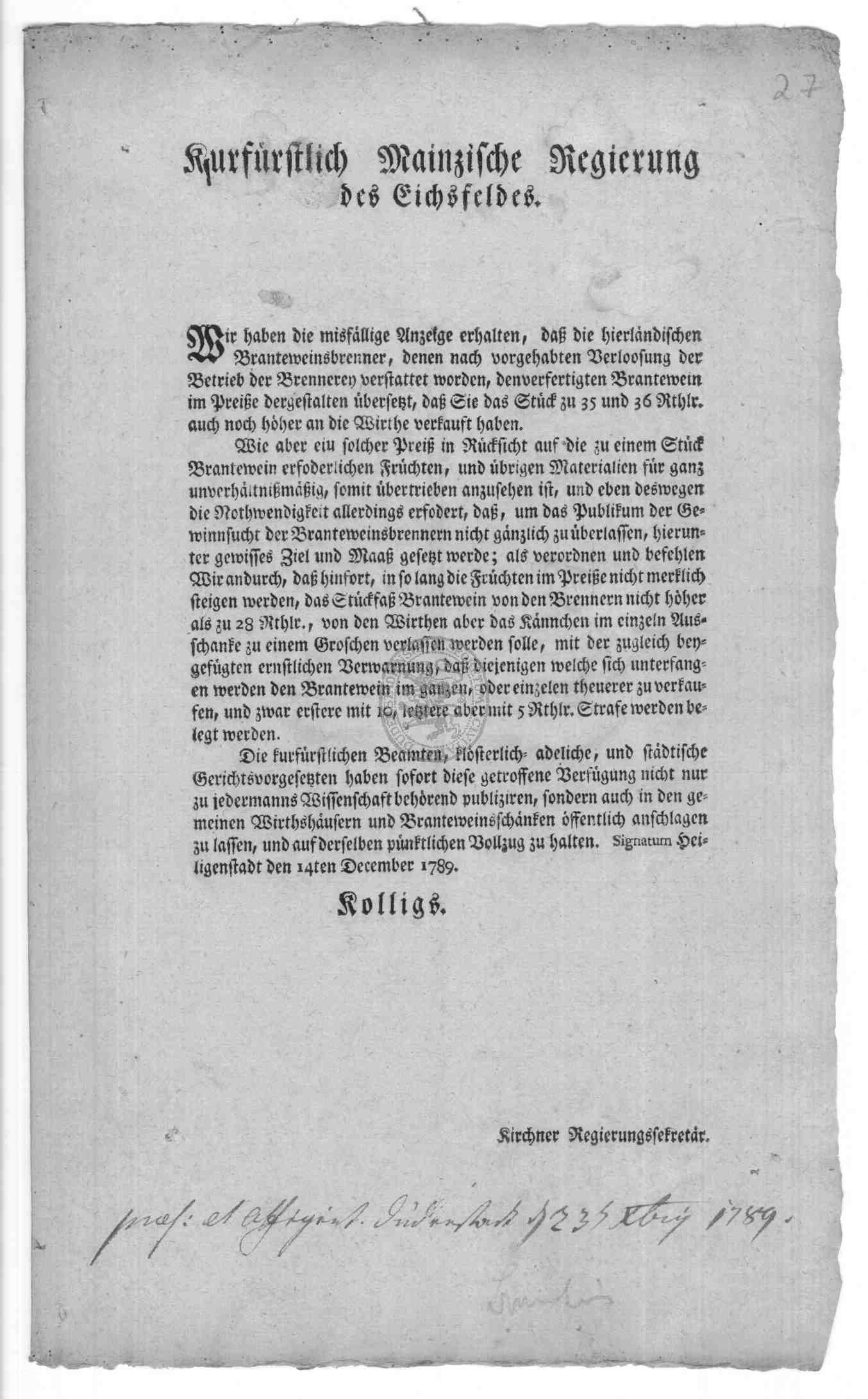| Titel: | Verordnungen und Erlasse zur Branntweinbrennerei in Duderstadt |