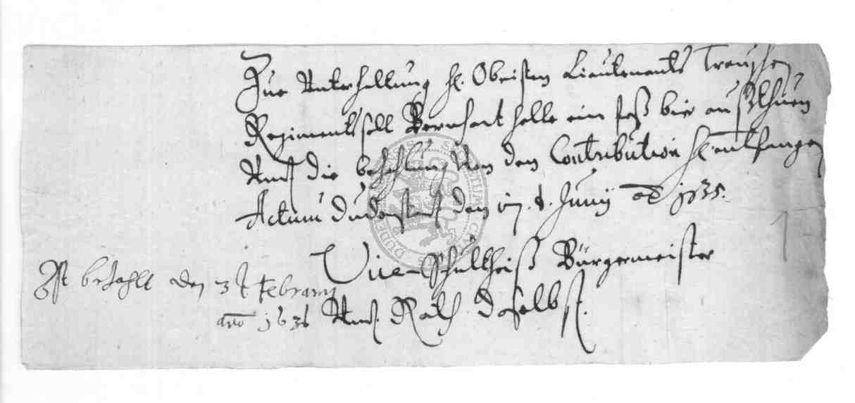 | Titel: | Anweisung eines Fasses Bier an Bernhart Holle für Einquartierung eines Regiments |