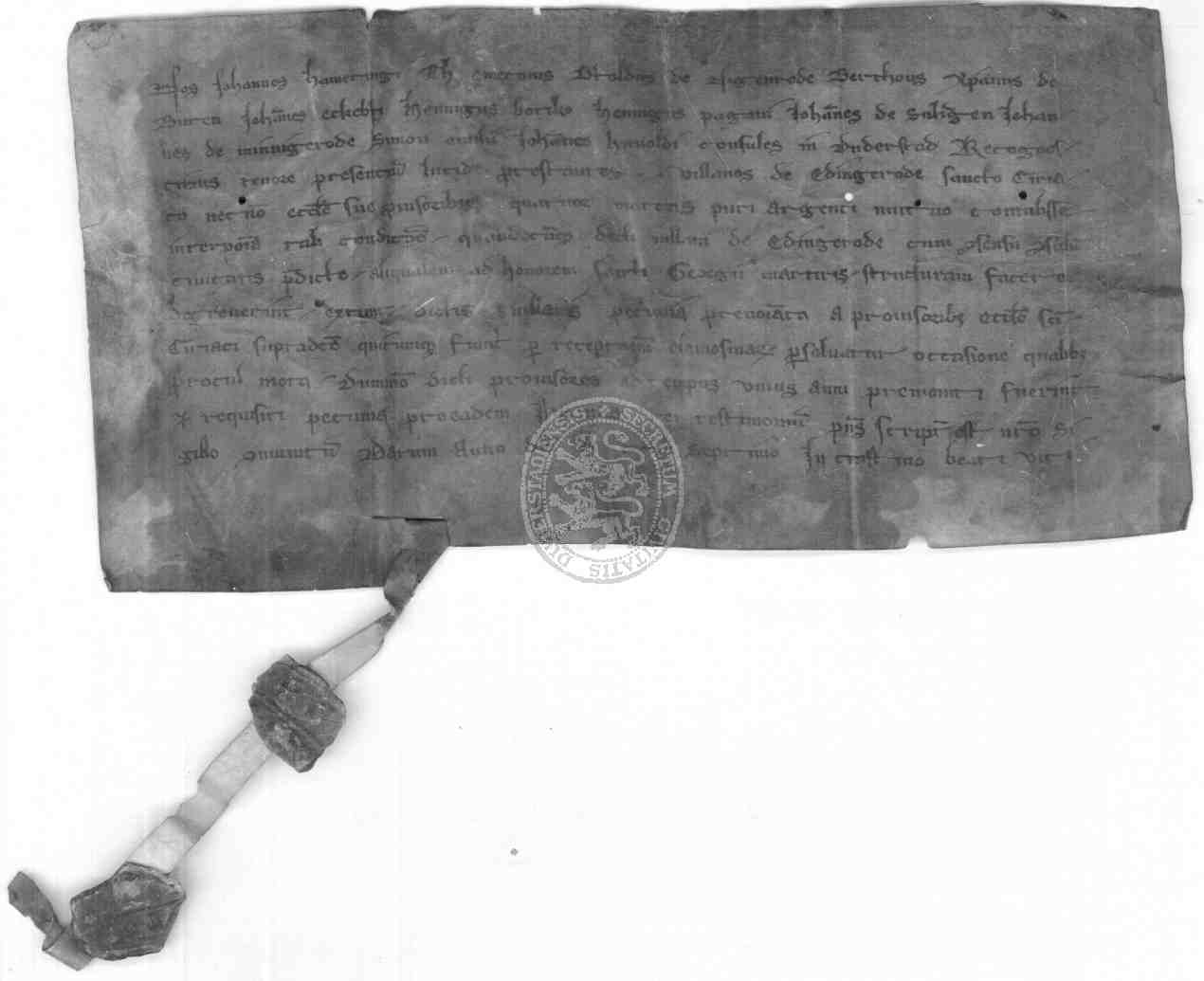 | Regest: | Der Rat der Stadt Duderstadt bekennt, daß die Landleute von Eidingerode der Kirche St. Ciriaci 4 Mark reinen Silbers geliehen haben unter der Bedingung, daß ihnen das Geld mit einjähriger Kündigung zurückgegeben werden muß, wenn sie mit Zustimmung des Rates einmal zur Ehre des hl. Georg ein Bauwerk zu errichten beschließen |