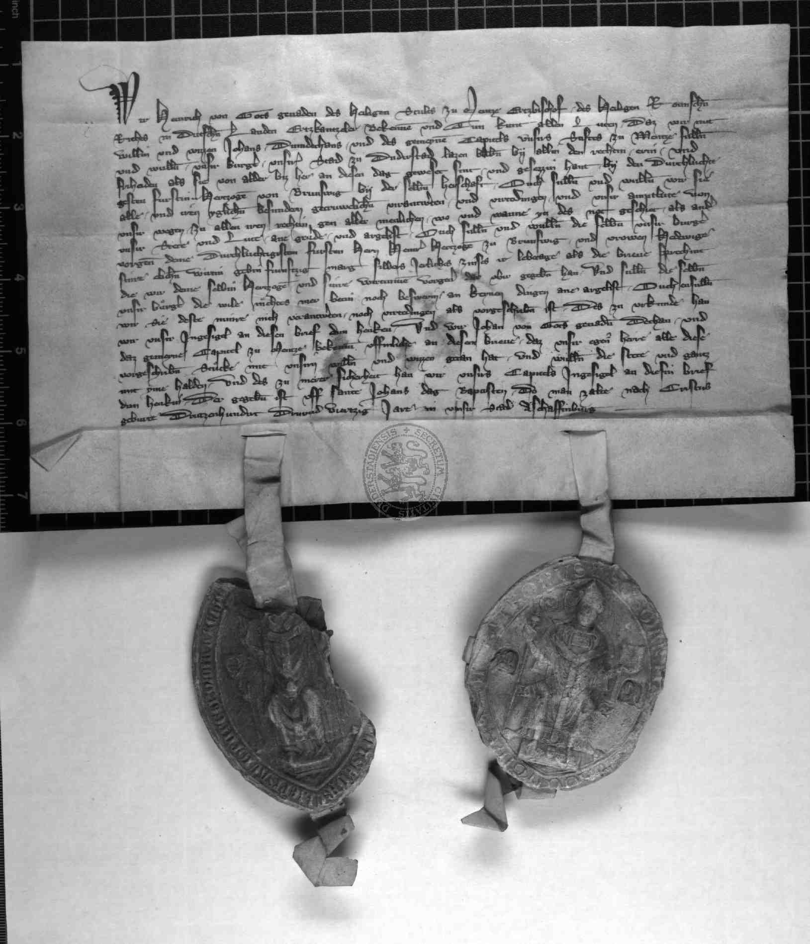 | Regest: | Erzbischof Heinrich bestätigt die Privilegien der Stadt und erklärt, daß dieselbe dem Herzog Heinrich und dessen Gemahlin Hedwig eine Leibrente von 50 Mark zu zahlen hat |