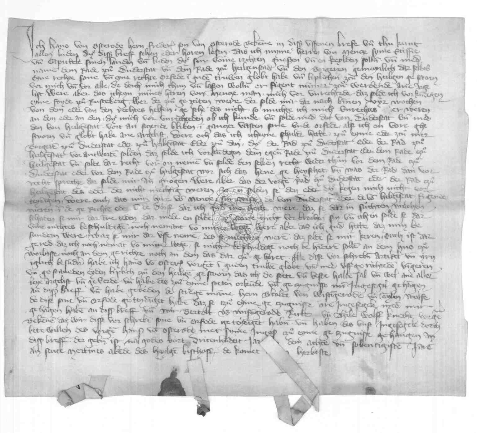 | Regest: | Hans von Osterode schwört dem Erzbischof und den Städten Duderstadt und Heiligenstadt Urfehde |