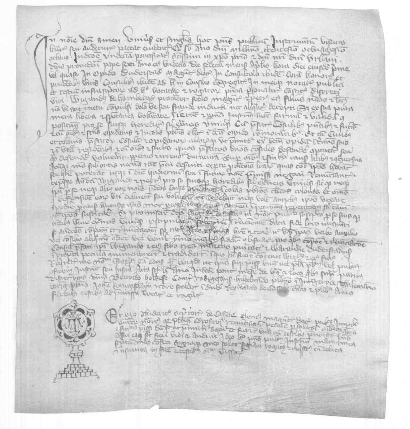 | Regest: | Notariats-Document über einen zwischen Wigand von Homberg, Procurator des Mainzer Stuhles, und seinem Sohn Peter einerseits und der Stadt andererseits geschlossenen Vergleich |