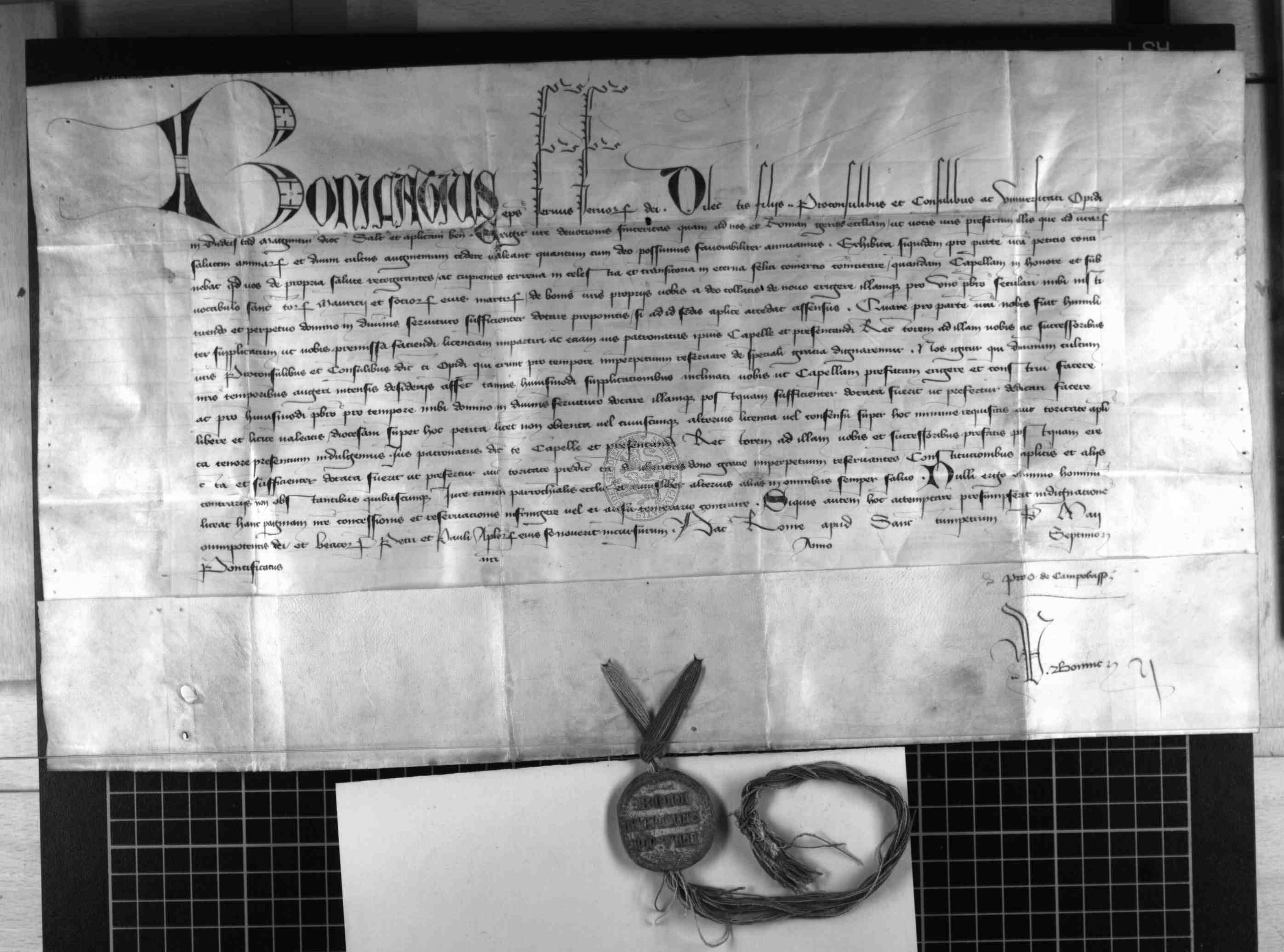 | Regest: | Papst Bonifatius IX. erlaubt der Stadt, die Kapelle des hl. Moritz auf dem Rathaus wiederherzustellen, und gibt ihr das Patronatsrecht |