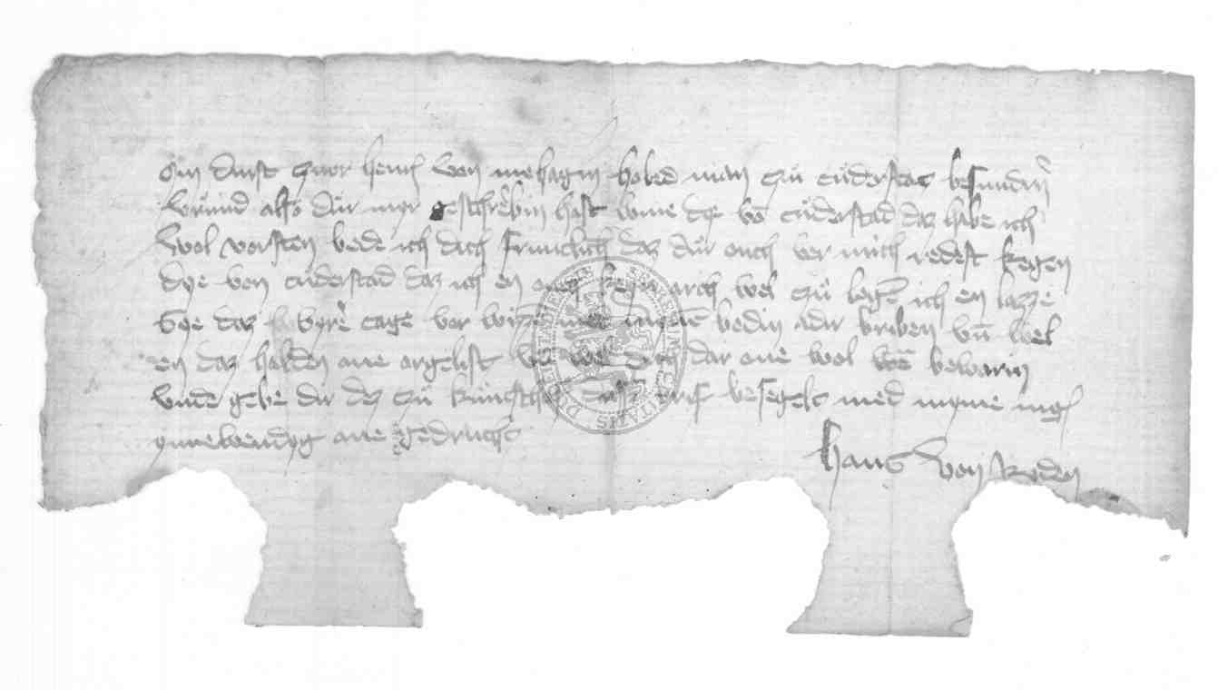 | Regest: | Hans von Riden schreibt dem Stadthauptmann Heinrich von Hagen, daß er die Stadt nicht angreifen wolle, ohne ihr dies 4 Tage vorher anzusagen |