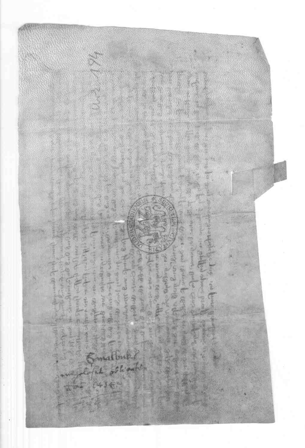 | Regest: | Der Rat bezeugt, daß die Stadt an Hans Smalbuk, des verstorbenen Hermann Smalbuk Sohn, und dessen Schwester Metele 4 Gulden Rente, halb auf Walpurgis und halb auf Michaelis fällig, für 83 rheinische Gulden wiederkäuflich verkauft hat |