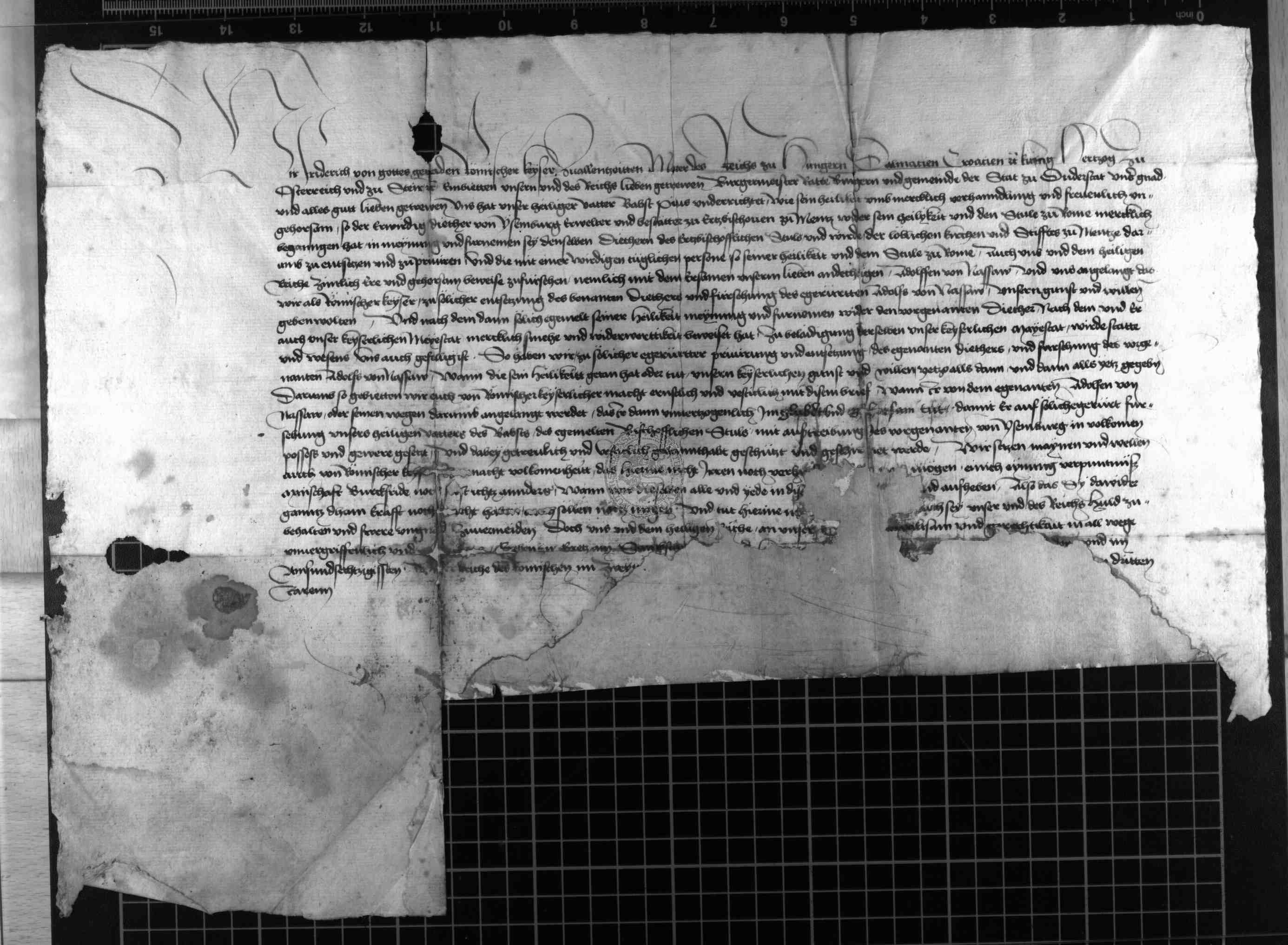 | Regest: | Kaiser Friedrich III. teilt der Stadt mit, daß er dem Vorhaben des Papstes Pius II., den Erzbischof Dietrich zu Gunsten Adolfs von Nassau seines Amtes zu entsetzen, seine Zustimmung erteilt habe |