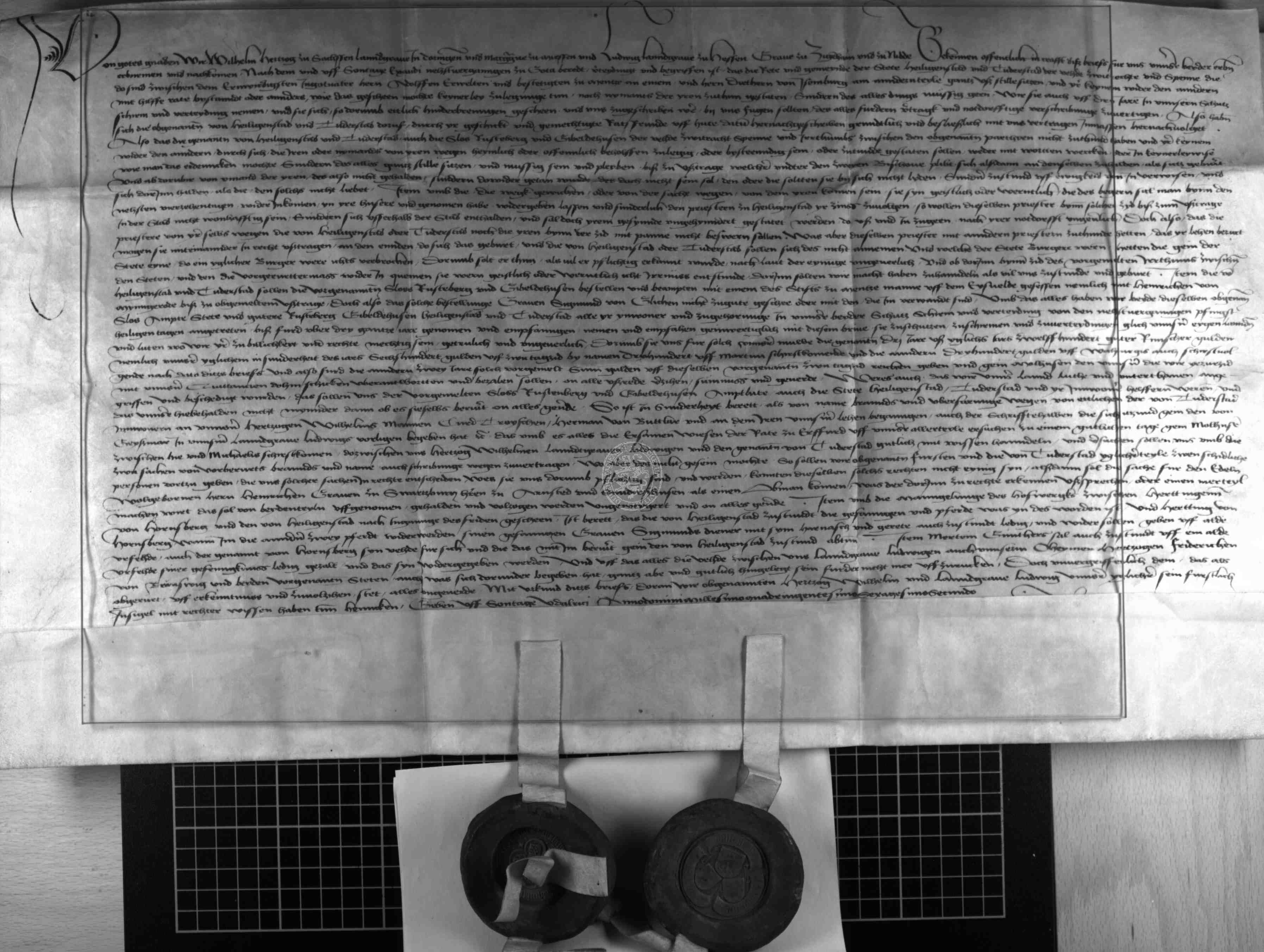| Regest: | Herzog Wilhelm von Sachsen und Landgraf Ludwig von Hessen nehmen die Städte Duderstadt und Heiligenstadt gegen Zahlung von 1200 rheinischen Gulden in ihren Schutz |