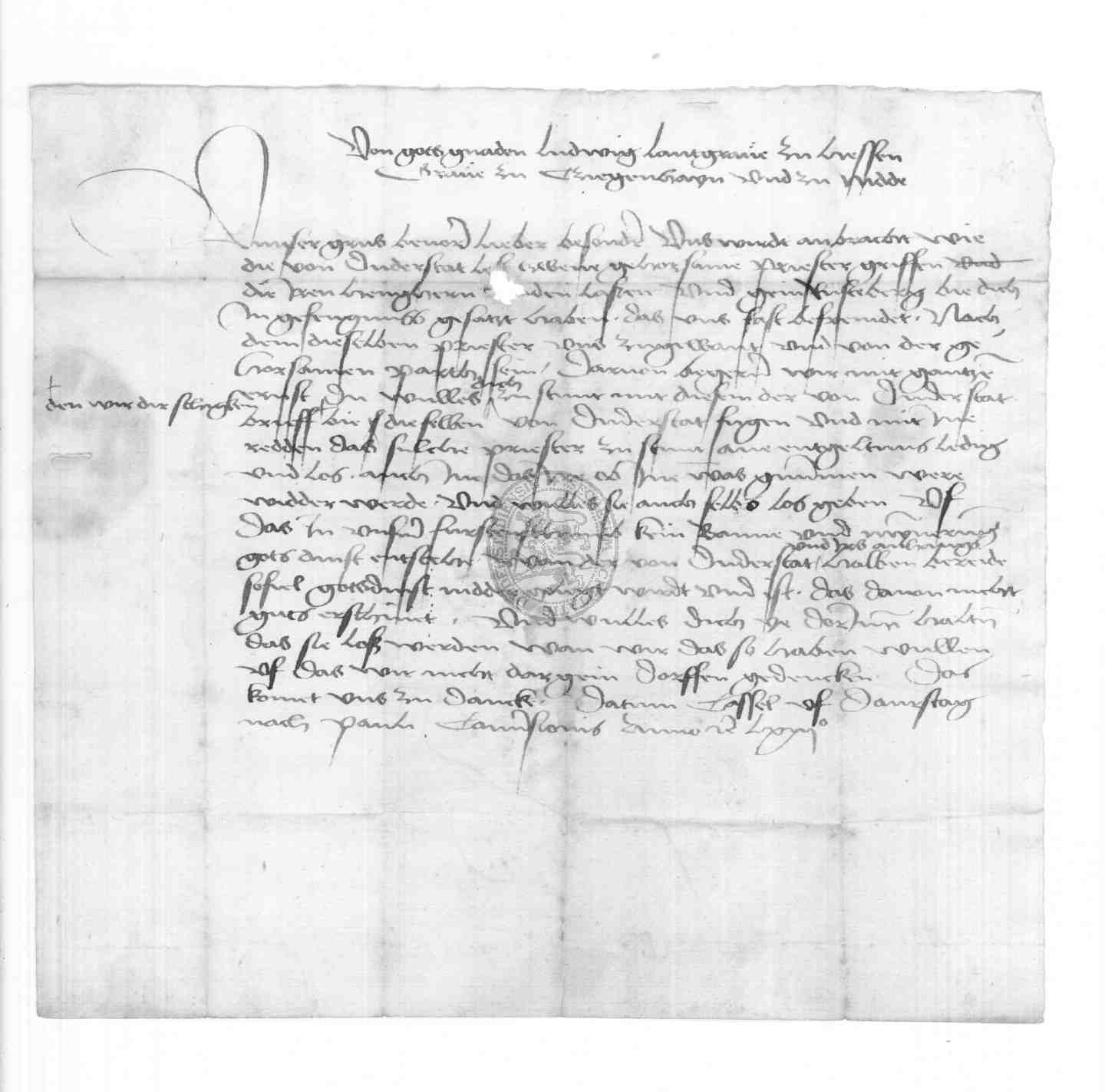 | Regest: | Landgraf Ludwig von Hessen beauftragt Heinrich von Minnigerode, dafür zu sorgen, daß 2 ihm gehorsame, von den Duderstädtern gefangene und nach Rusteberg geführte Priester wieder freigegeben werden |