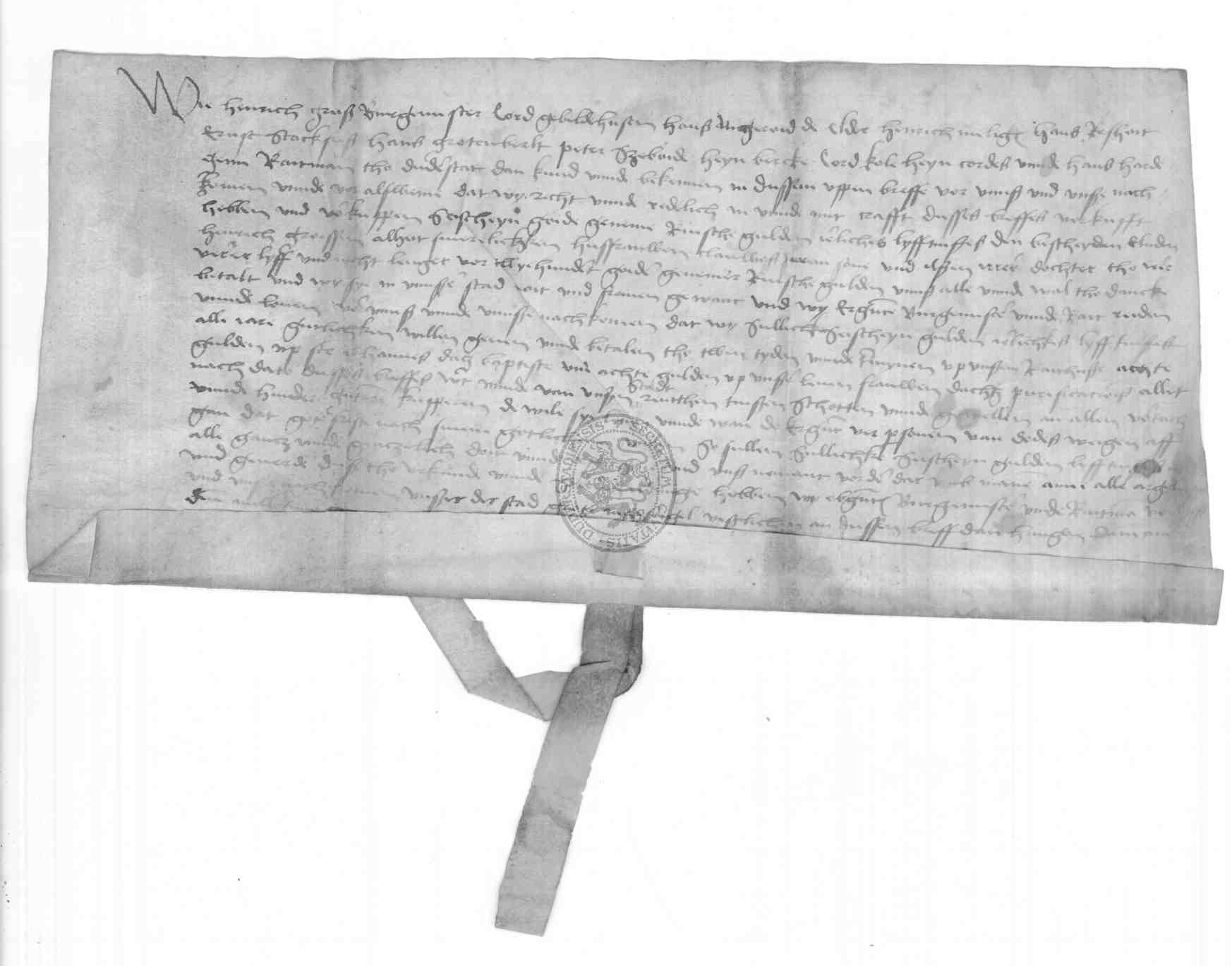 | Regest: | Der Rat verkauft eine Leibrente von 16 rheinischen Gulden, auf Johannis Baptiste und Lichtmeß mit 8 Gulden fällig, für 200 Gulden Heinrich Große, seine Ehefrau Adelheid und ihre Kinder Claus und Ilse |