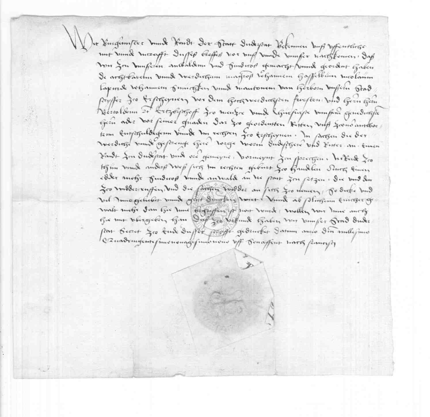 | Regest: | Der Rat ernennt Johann Hasselbum, Nicolaus Lapicidus, Johann Smuchk und Manto von Herborn, den Stadtschreiber, zu Anwälten und Syndiken vor dem Erzbischof Bertold oder dessen dazu verordneten Räten in dem Streite, den der Deutschherr und Ritter Jürgen Worm gegen die Stadt erhebt |