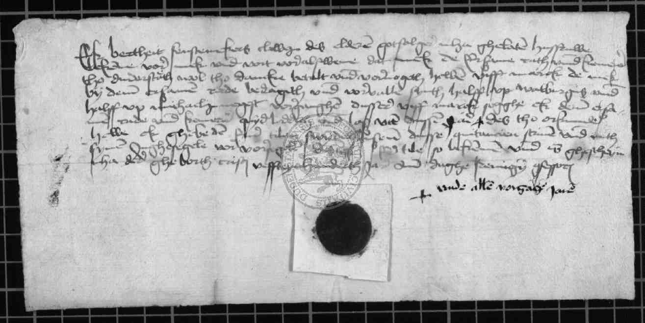 | Regest: | Bertheit Fenstermekers, Witwe Clawes des Älteren, quittiert dem Rate zu Duderstadt über den Empfang von 5 Mark jährlicher Rente. Tile Swydershusen besiegelt für sie die Urkunde |