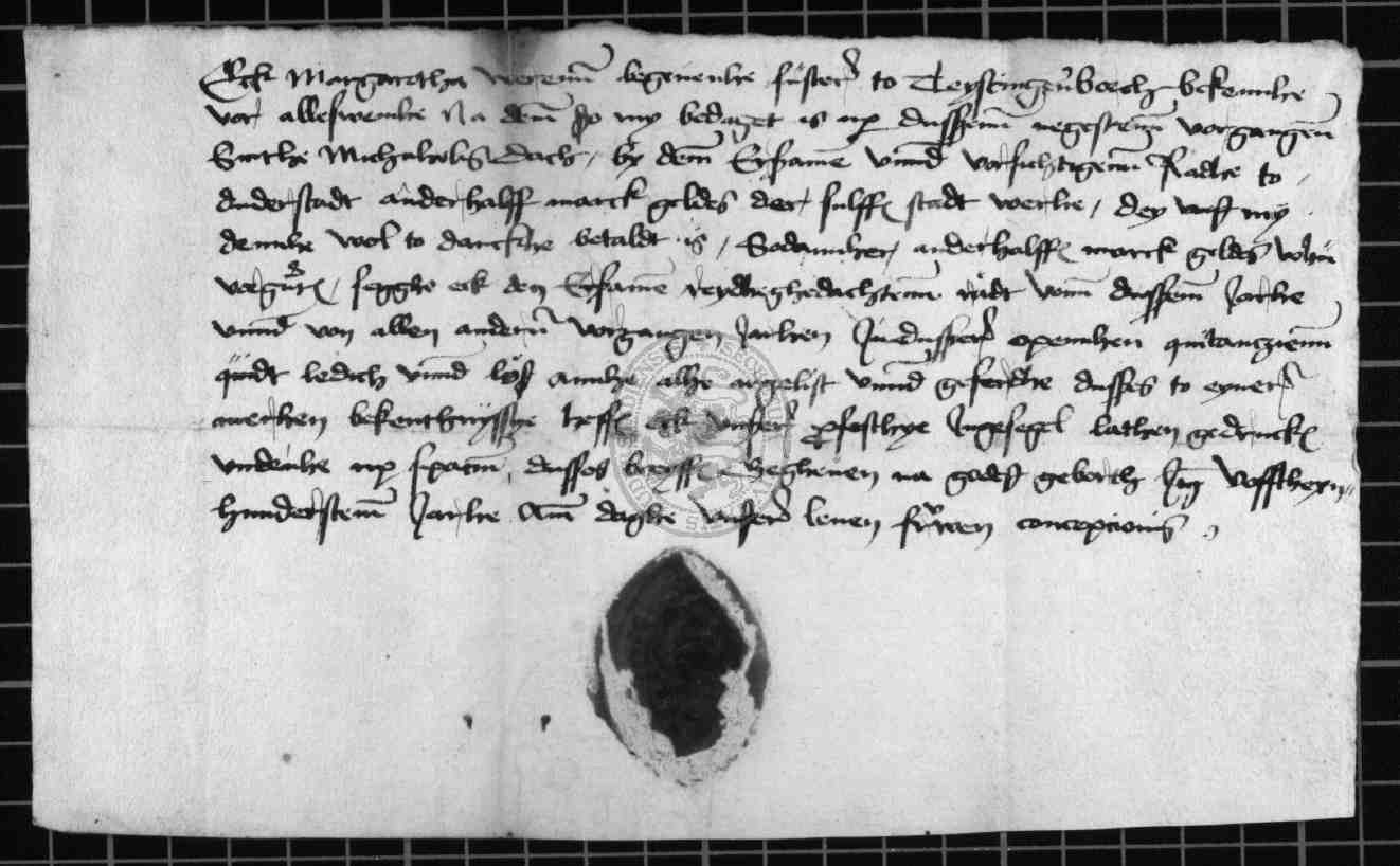 | Regest: | Margaretta Weren, Beginenschwester zu Teistungenburg, quittiert über 1 1/2 Mark Rente (dud. Währung) dem Rate |