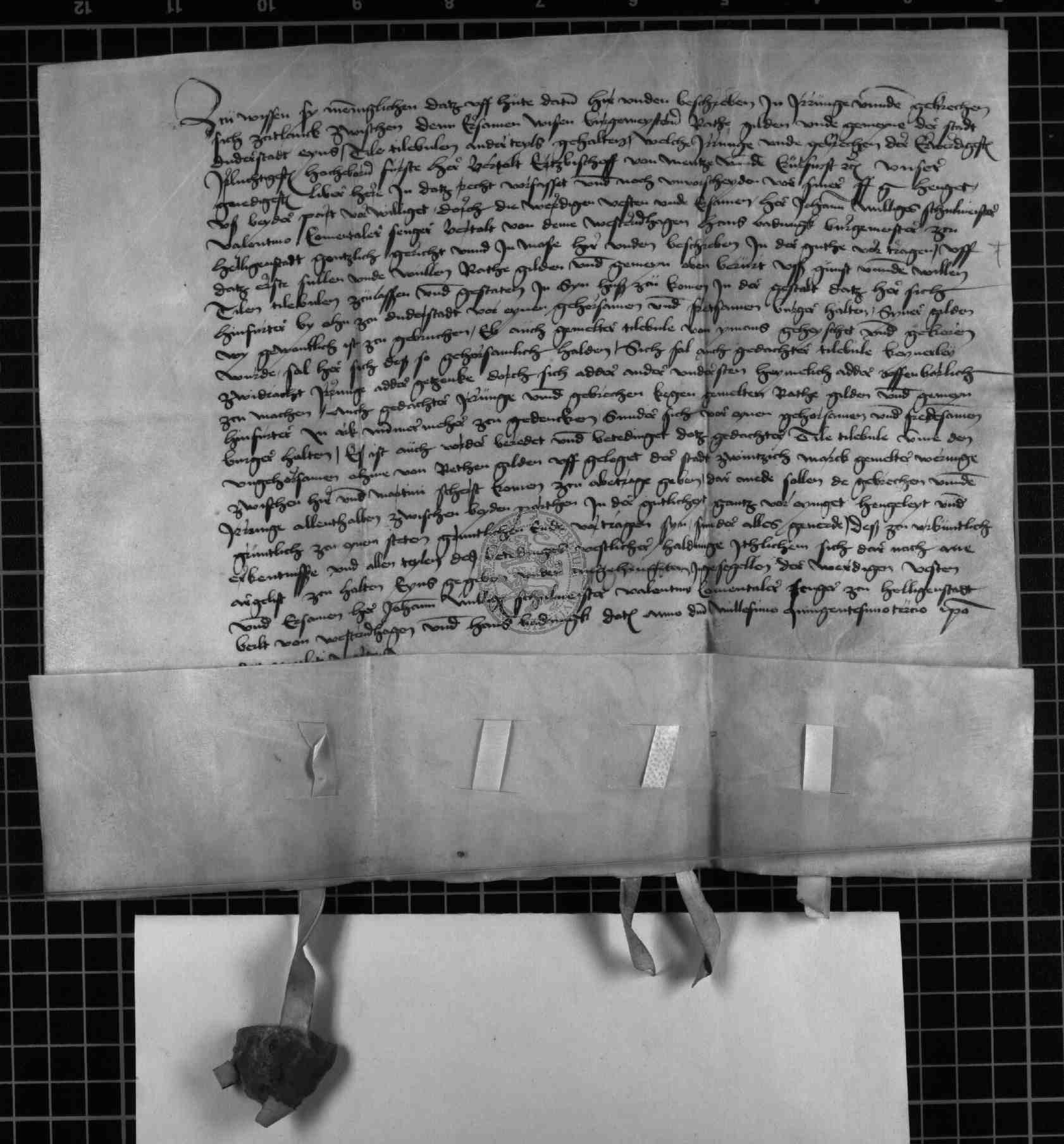 | Regest: | Auf Veranlassung des Erzbischofes von Mainz, Berthold, wird ein Streit zwischen Rat und Gilden zu Duderstadt einerseits und Tile Tilebulen anderseits durch Vermittlung von Johann Milliges, Scholaster, Valentin Comentaler, Sänger, dann Bertholt von dem Hagen und Hans Badung, Bürgermeister zu Heiligenstadt, gütlich vertragen und beigelegt. Tile Tilebule soll gegen Zahlung von 20 Mark Duderst. Währung wieder aufgenommen werden, sich aber als friedfertiger und gehorsamer Bürger verhalten |