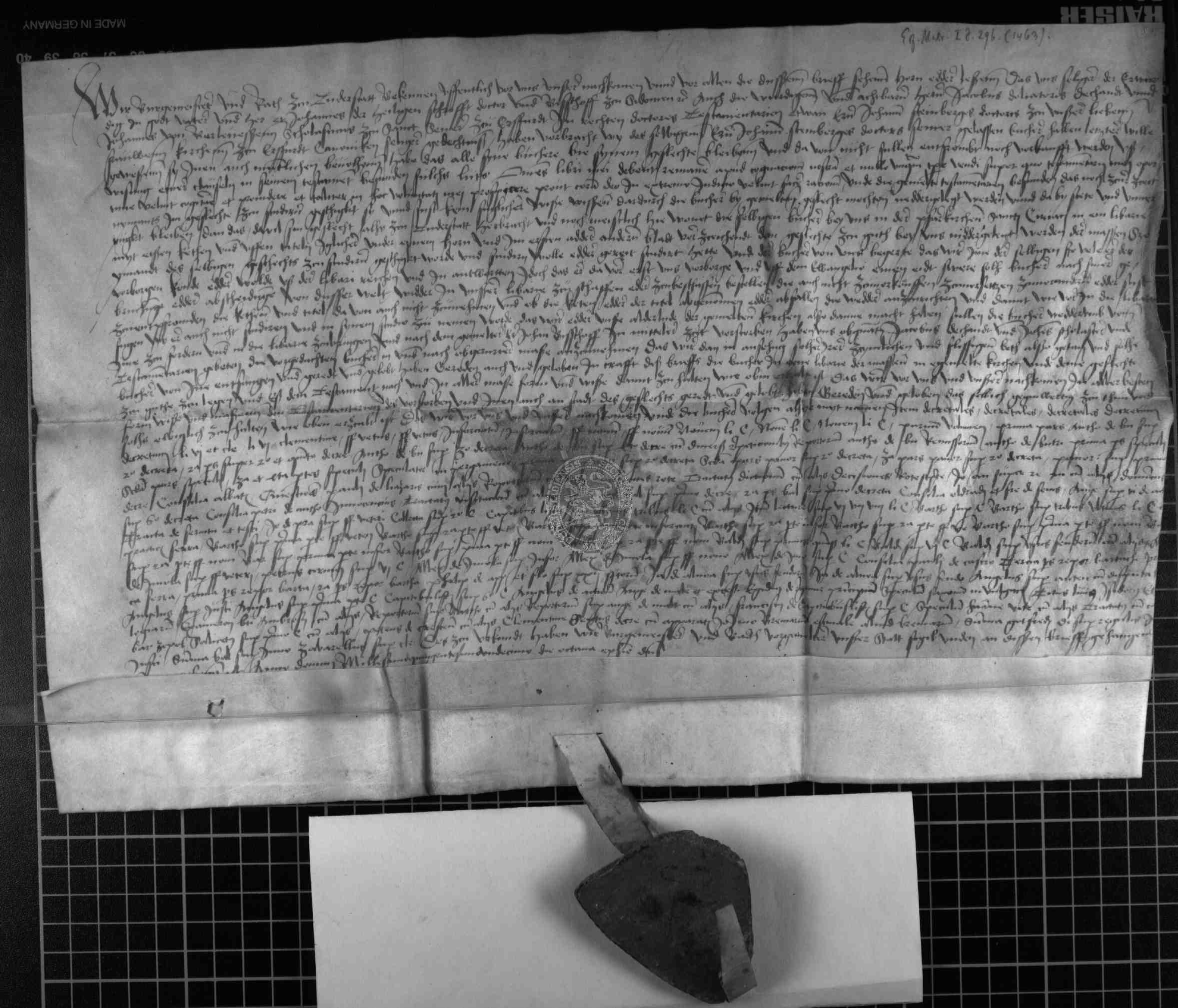 | Regest: | Der Rat zu Duderstadt übernimmt von den drei Testamentsvollstreckern, dem verstorbenen Ern Johannes, Bischof von Sidonien, dem Herrn Jacobus Dolitor, Dechant zu St. Severi zu Erfurt und dem Johannes von Berlevessen, Scholaster ebendaselbst, die Bibliothek des verstorbenen Ern Dr. Johannes Steinberg, Kanonikus zu Unser lieben Frauen zu Erfurt, als Depositum. Nach dem Testamente des Steinberg sollen die Bücher, deren Titel am Ende der Urkunde aufgezählt sind, Angehörigen seines Geschlechtes, das in Duderstadt beheimatet ist, für ihr Studium zur Verfügung stehen und sollen in der Cyriacuskirche in einer "libarie" sorgfältig aufbewahrt werden |