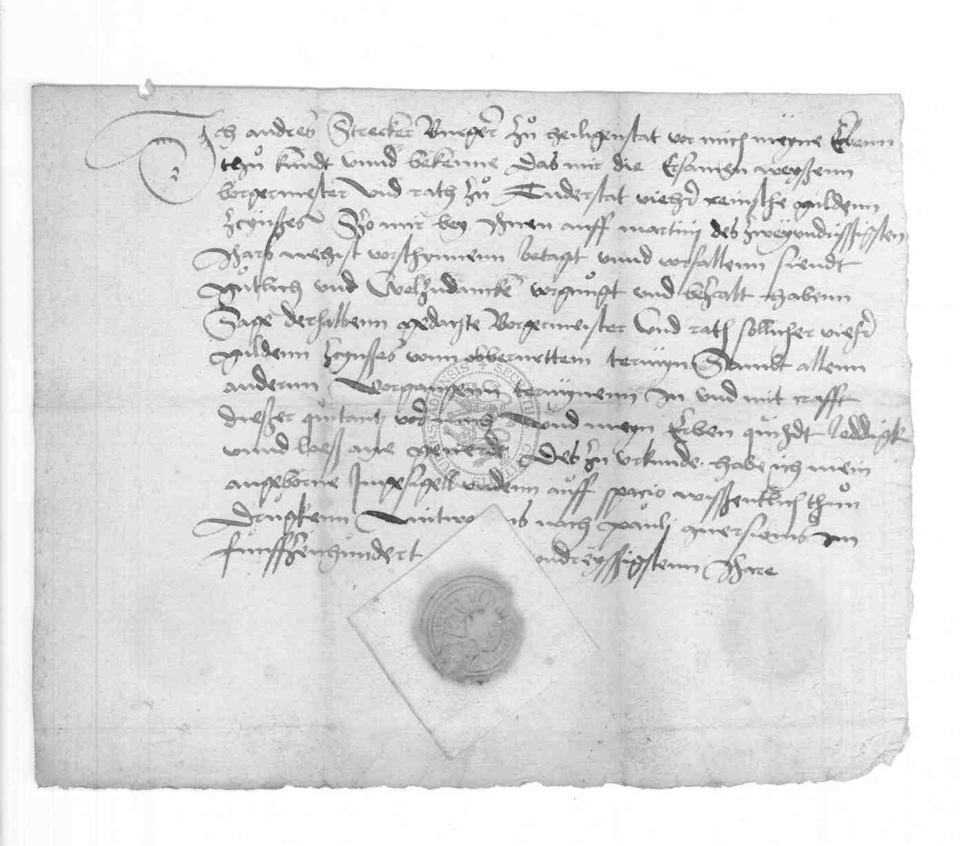 | Regest: | Andreas Strecker, Bürger zu Heiligenstadt, quittiert dem Rate zu Duderstadt über 4 rhein. Gulden Zinsen |