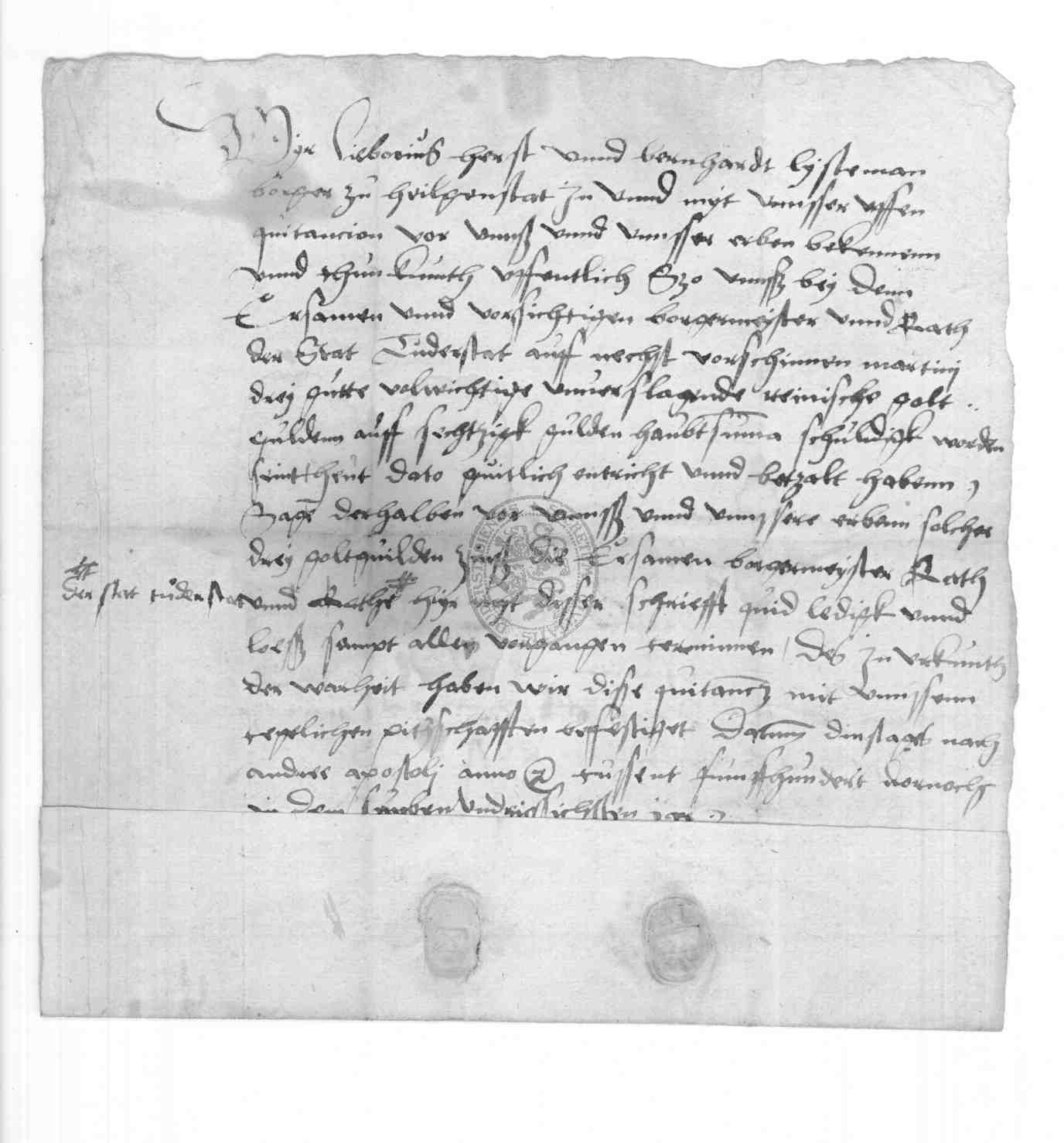 | Regest: | Liborius Herst und Bernhardt Lysteman, Bürger zu Heiligenstadt, quittieren dem Rate zu Duderstadt über 3 rhein. Gulden Zinsen von 60 Gulden Kapital |