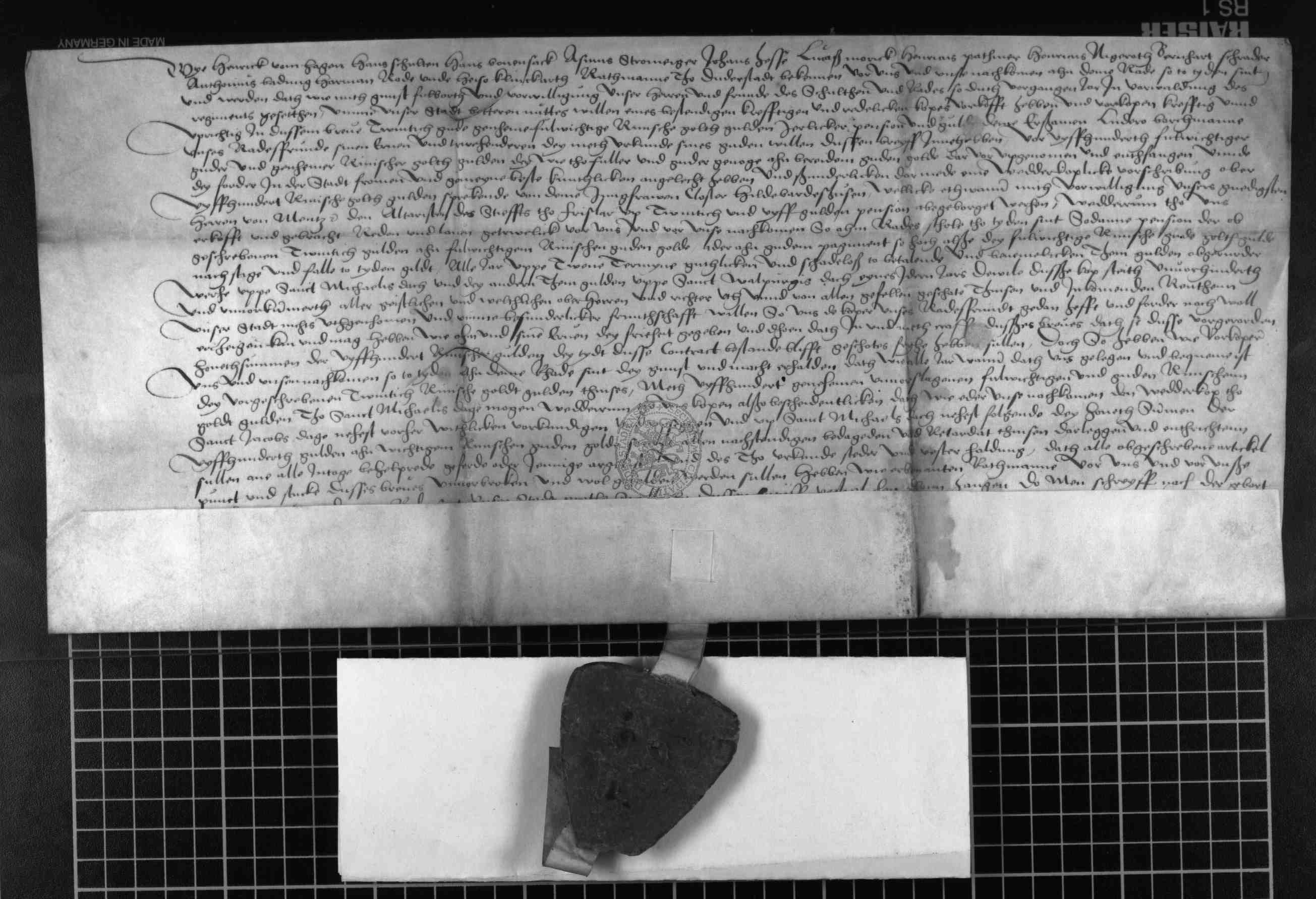 | Regest: | Der Rat der Stadt Duderstadt (Henrick vom Hagen, Hans Schulten, Hans Bonensck, Asmus Stromeiger, Johans Hesse, Lucas Morick, Henricus Pathiner, Henricus Nigeroth, Bernhart Schrader, Anthonius Badung, Harman Rode und Heiso Klinckarth) bezeugt, daß er mit Zustimmung des alten Rates 20 rhein. Goldgulden jährlicher Rente dem Ratsfreunde Luder Borchman und seinen Erben und Treuhändern für 500 rhein. Gulden wiederkäuflich verkauft habe. Diese 500 Gulden hat der Rat verwandt, um eine wiederkäufliche Verschreibung von 500 Gulden vom Kloster Hilwardshusen zurückzukaufen, die mit Bewilligung des Erzbischofs von Mainz den Altaristen des Stiftes zu Fritzlar für 25 Gulden jährlich abgeborgt waren |