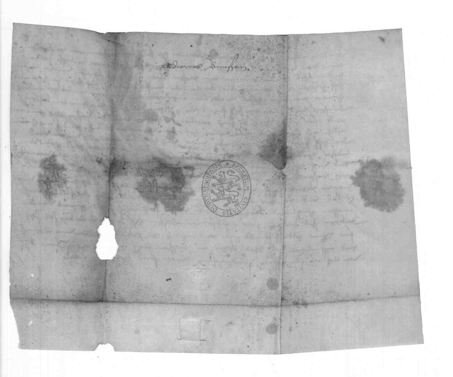 | Regest: | Bürgermeister und Rat zu Duderstadt verkaufen wiederkäuflich den Hof in der Schindergasse bei der Wiese der Wollenweber, der dem Rate nach Heinrici Pattiners Tode wieder angestorben ist, dem Bürger Andreas Bunsen für 6 Stiege Talergroschen; Bunse soll den Hof, solange er ihn besitzt, schoßfrei haben. Ein Wiederkauf ist erst nach drei Jahren statthaft |