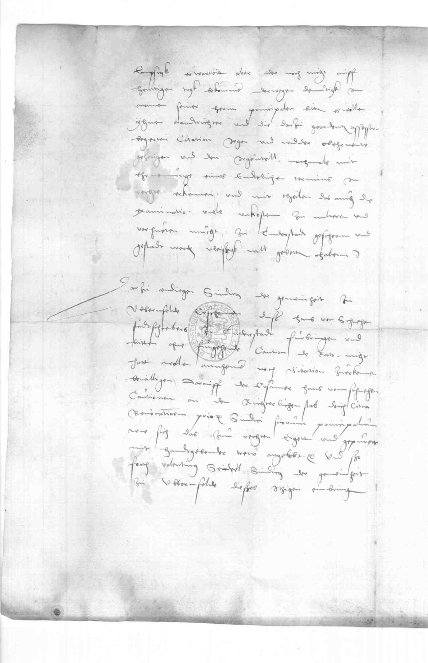 | Regest: | Schreiben, betreffend eine Citation vor das Kurfürstliche Landgericht in einer Streitsache zwischen Duderstadt und der Dorfschaft Obernfeld. Die Stadt ist vertreten durch den Stadtschreiber Hans von Schnehen, Obernfeld durch den Syndikus Valentinus Seidell. Als Zeugen werden genannt: Hans von Minnigeroda, sowie Arndt und Ernst von Westernhagen |