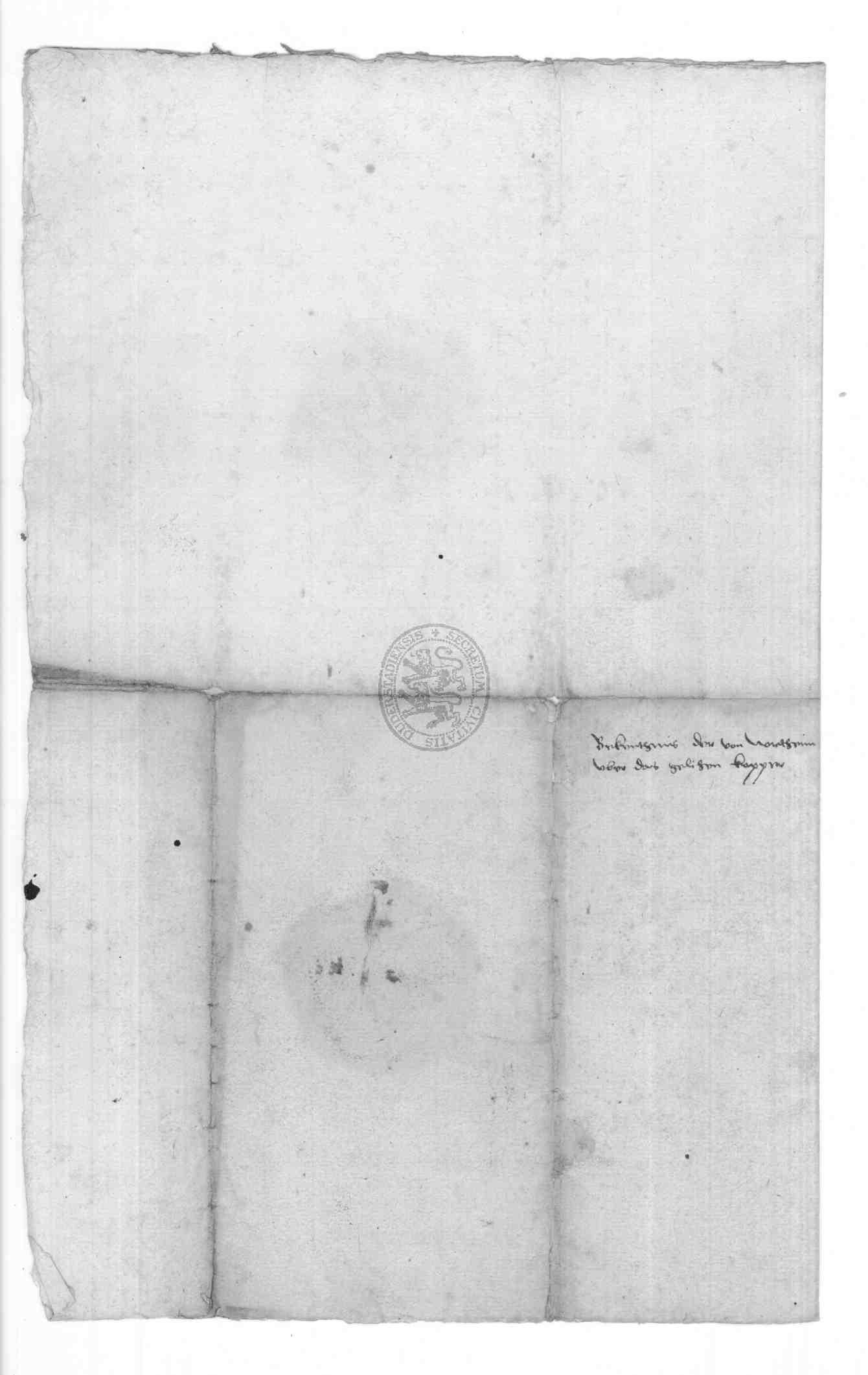 | Regest: | Der Rat der Stadt Northeim bekennt, vom Rate der Stadt Duderstadt 10 1/2 Zentner und 10 Pfund altes Pfannengut vorgestreckt erhalten zu haben, und verspricht die Rückgabe, sobald der Duderstädter Rat Pfannen zu gießen beabsichtigt, oder aber dann den zeitigen Preis des Kupfers zu zahlen |