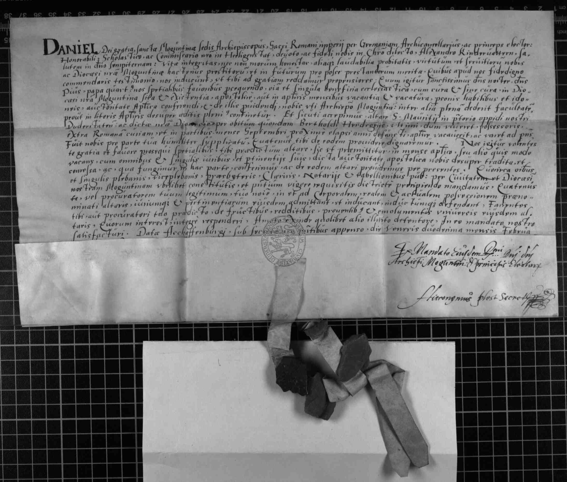 | Regest: | Erzbischof Daniel von Mainz konferiert den durch den Tod des bisherigen Inhabers Bertold Herdegen (Sept. 1562) erledigten Altar St. Mauritii auf dem Rathause zu Duderstadt dem Scholaster und Commissarius Alexander Kindervater zu Heiligenstadt |