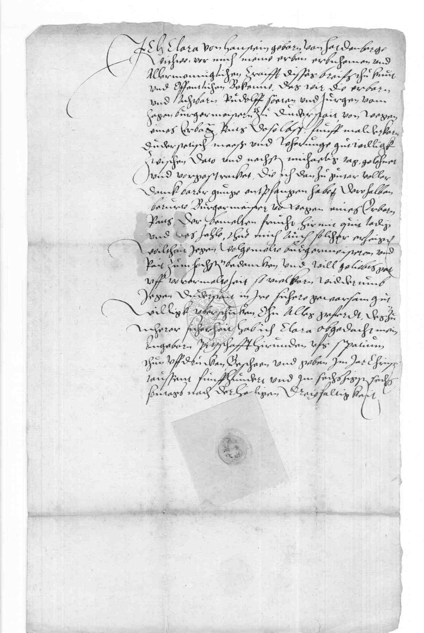 | Regest: | Clara von Hanstein, geborene von Hardenberg, bekennt, vom Rate zu Duderstadt durch die Bürgermeister Rudolf Soeten und Jürgen vom Hagen 5 Malter Korn Duderst. Maßes erhalten zu haben und verpflichtet sich zum Ersatz |