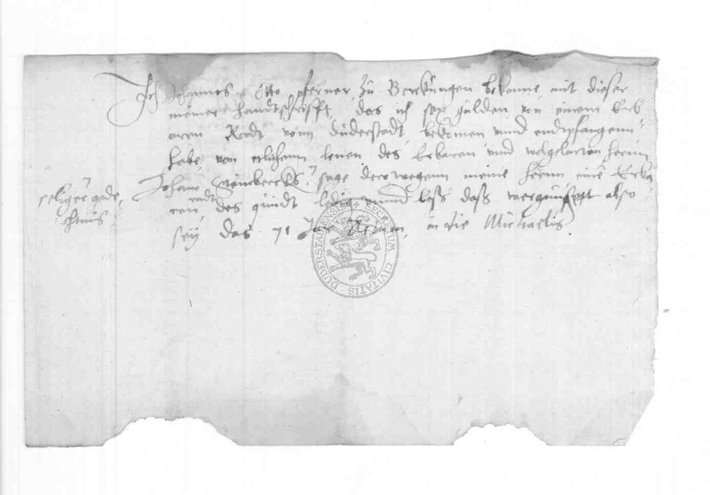 | Regest: | Johannes Otto, Pfarrer zu Birkungen, quittiert dem Rate zu Duderstadt über 6 Gulden, die er empfangen hat "von etlichen lenen des Erbaren vnd wolgelarten Herren Johan Steinbercks seliger gedechtnis" |