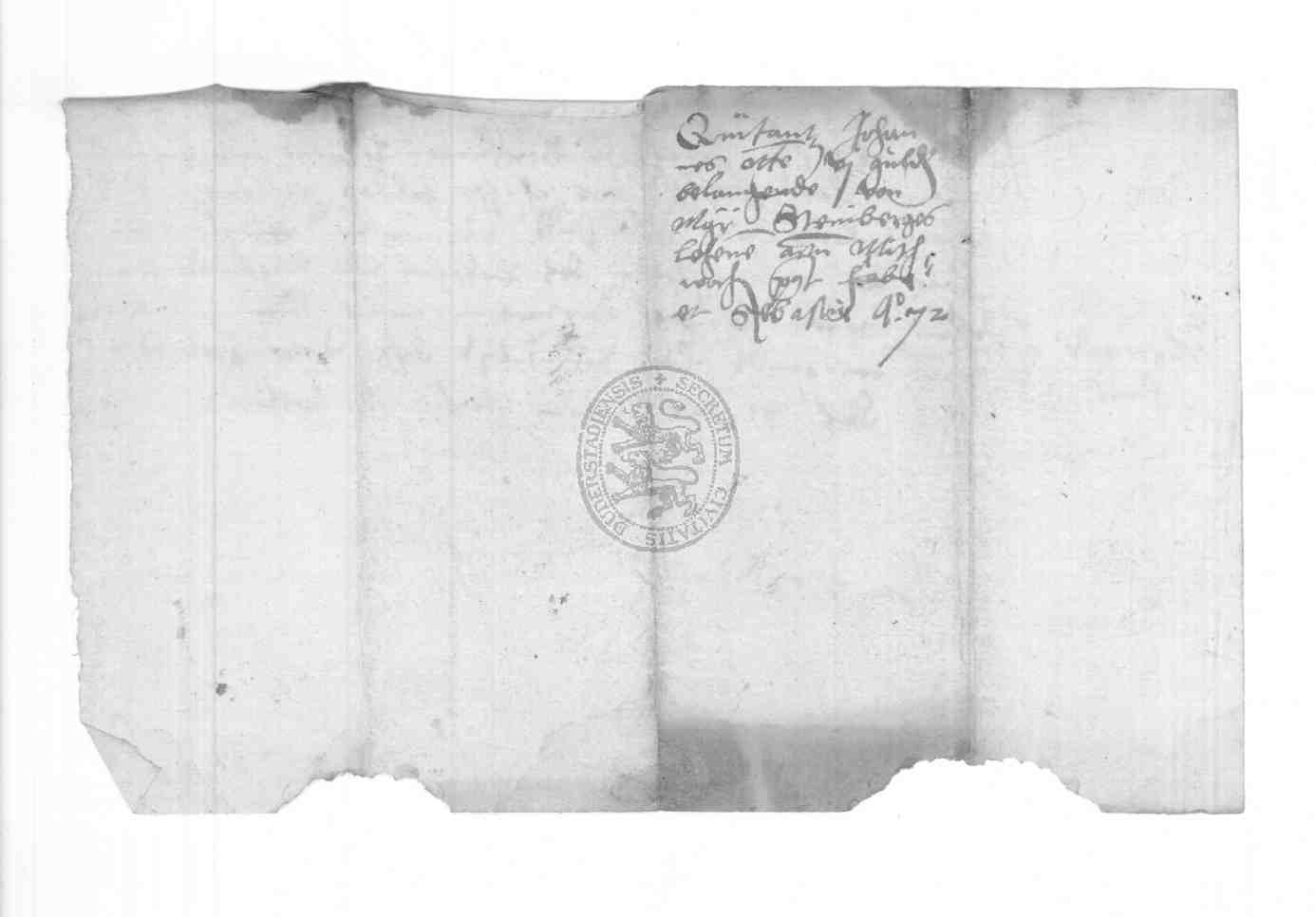 | Regest: | Johannes Otto, Pfarrer zu Birkungen, quittiert dem Rate zu Duderstadt über 6 Gulden, die er empfangen hat "von etlichen lenen des Erbaren vnd wolgelarten Herren Johan Steinbercks seliger gedechtnis" |