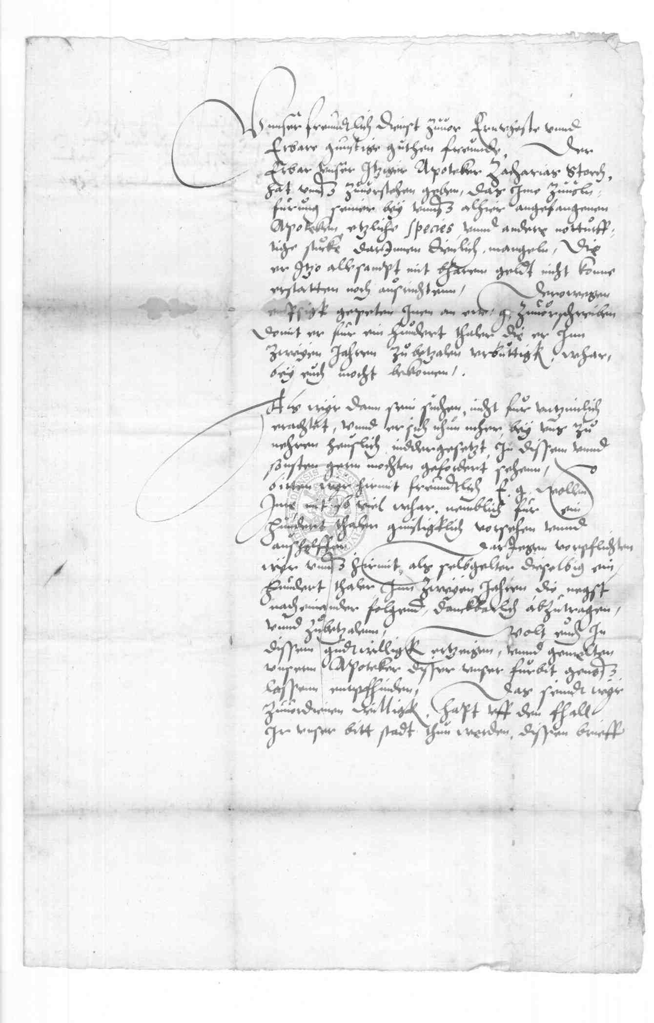 | Regest: | Der Apotheker Zacharias Storch zu Duderstadt hatte dem Rate vorgetragen, daß ihm zur Unterhaltung der hiesigen Apotheke etliche species und andere notwendige Stücke fehlten und zu deren Anschaffung um ein Darlehen von 100 Taler gebeten, das er innerhalb zweier Jahre abzahlen will. Der Rat verpflichtet sich nun gegenüber Joachim Finoldt und Georg N. zu Leipzig, für die dem genannten Apotheker zu liefernden Sachen innerhalb 2 Jahre 100 Taler zu zahlen |