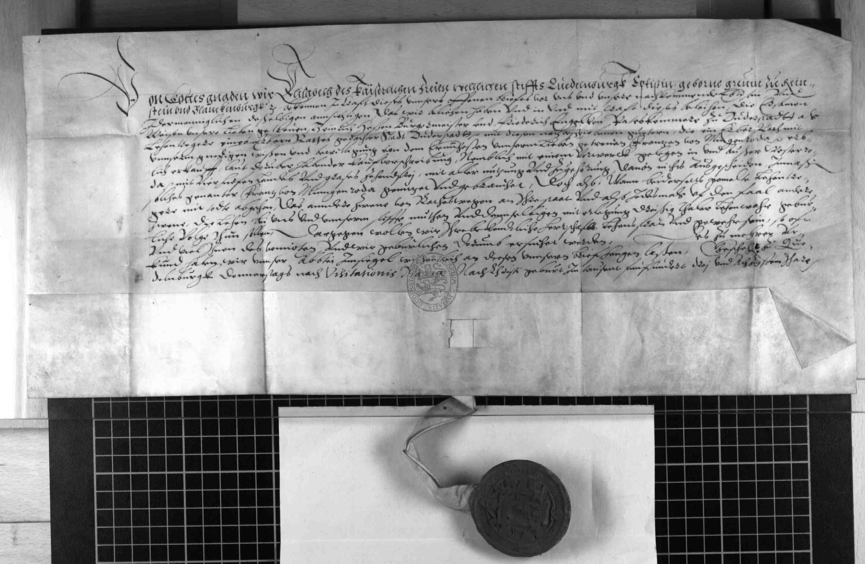 | Regest: | Äbtissin Elisabeth zu Quedlinburg, geb. Gräfin zu Reinstein und Blankenburg, belehnt den Rat der Stadt Duderstadt (Treuhänder: Bürgermeister Heinrich Hesse und Ratskämmerer Friedrich Engelke) mit einem Vorwerke in und außer Westerode und mit 4 Hufen Landes und zehntfreien Grases, welches der Rat von Franz von Minnigerode gekauft hat. Die Lehnware beträgt 30 Taler |