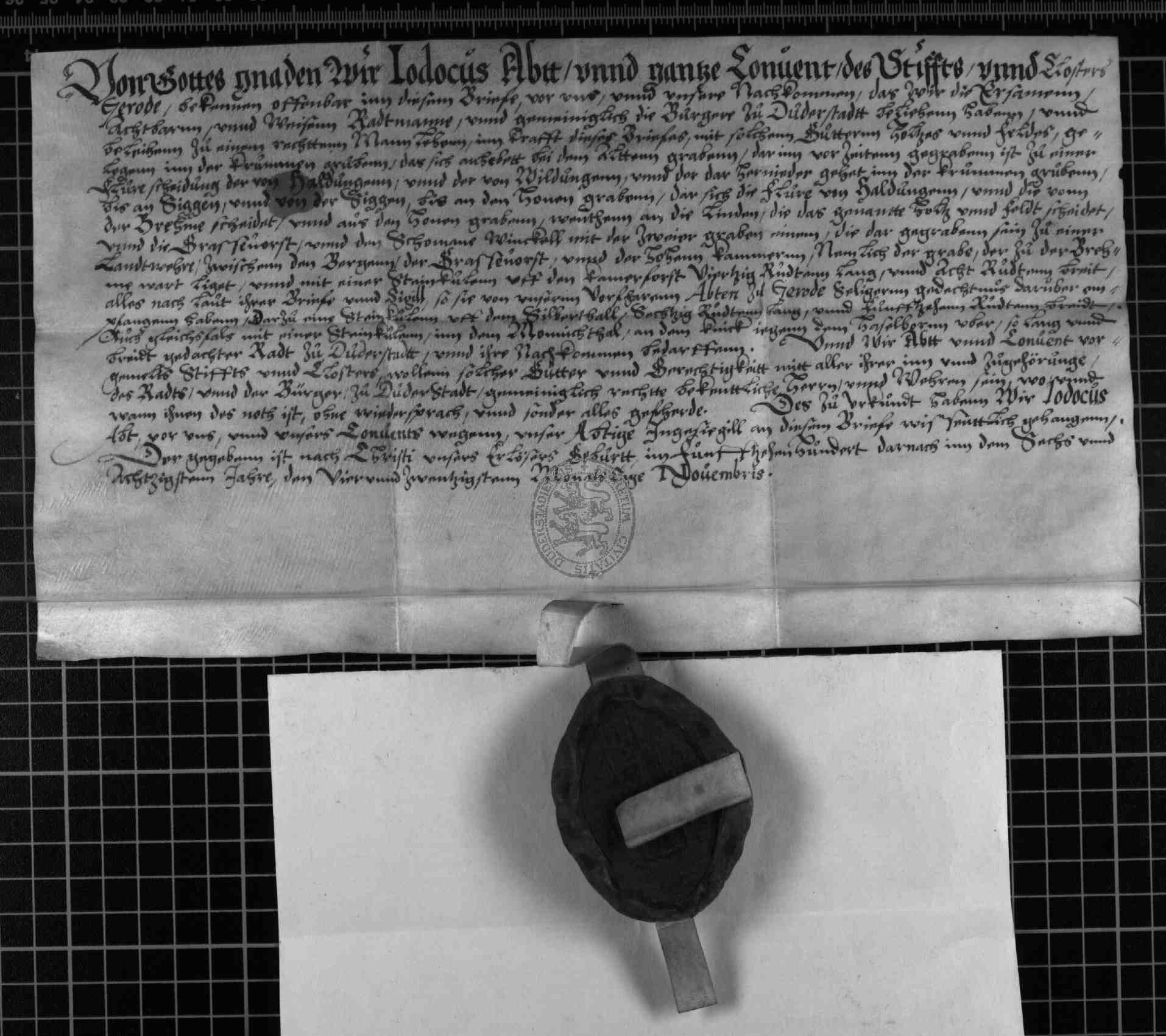 | Regest: | Abt Jodocus und ganzer Konvent des Stiftes Gerode belehnt die Stadt Duderstadt mit dem Klosterlehen wie 1536 und 1557. Hinzugefügt ist noch: auch mit einer Steingrube in dem Monnichthal an dem Knick gegenüber dem Haselborn, solang und breit sie die Stadt bedarf |
