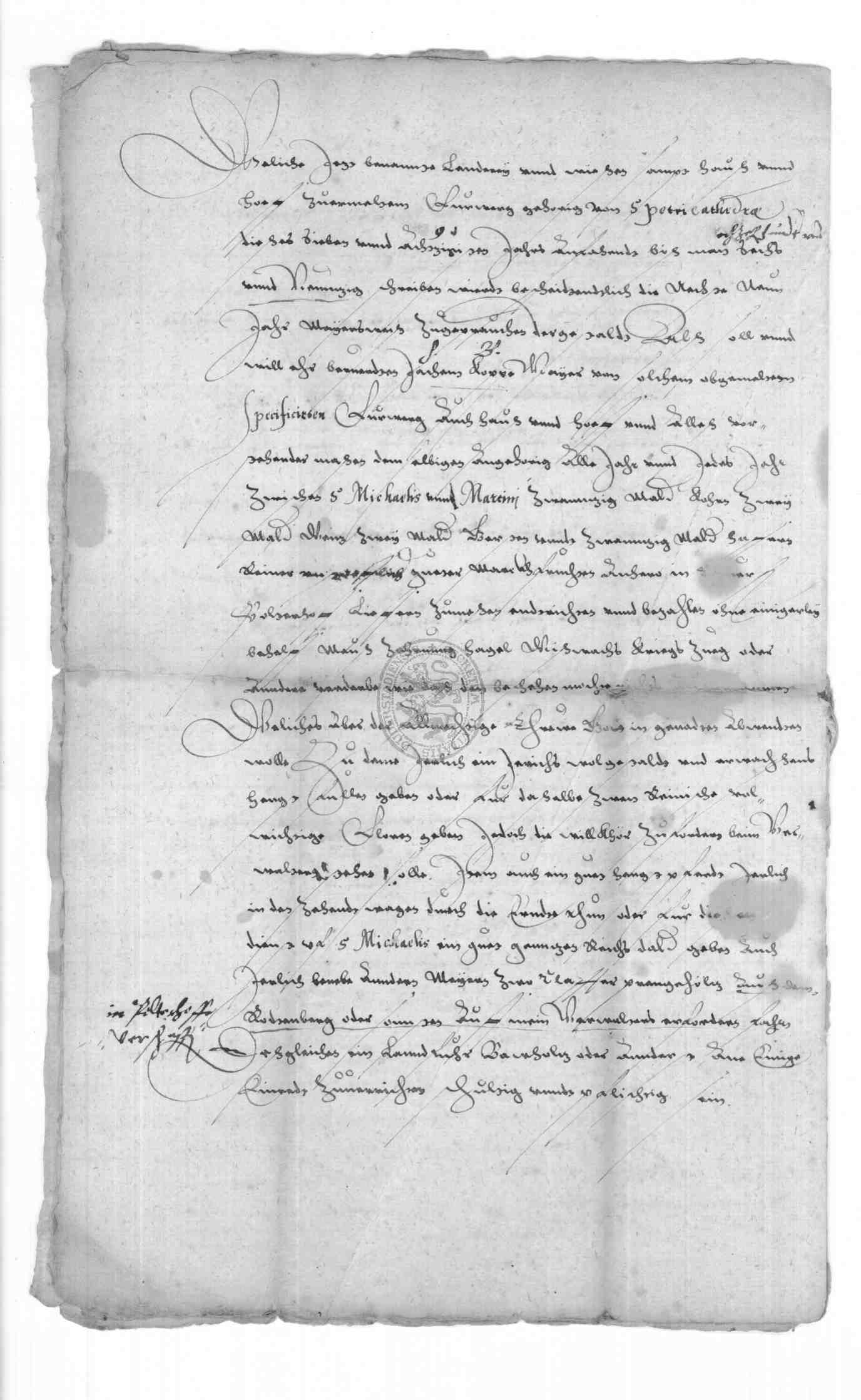 | Regest: | Meierrevers des Jachem Kopp zu Rollshausen, der bekennt, daß ihm Johannes Cammerer, Verwalter des Kurf. Pöhlderhofes zu Duderstadt, im Namen des Erzbischofs Wolffgang von Mainz, mit Wissen sowohl des Herrn Heinrich Bunthe, Propst und Dechant zu Heiligenstadt, Probst zu Nörten und Kommissar des Eichsfeldes, als auch des Heinrich Thunhose, Vogt auf dem Rusteberg, das dem Pöhlderhof zuständige sog. große Vorwerk zu Rollshausen wiederum auf 9 Jahre von St. Petri Cathedrae (= Febr. 22) 1587 an verpachtet hat. In dem an diesem Tage ausgestellten Meierbrief, der transumiert ist, werden die Ländereien des Vorwerkes, getrennt nach Winter-, Sommerfeld, Brache und Gras einzeln (Flurnamen und Nachbarn) in summa 131 Morgen Äcker und 13 1/2 Morgen Gras aufgeführt und die Pachtbedingungen festgesetzt. Jachem Kopp hat jährlich zwischen Michaelis und Martini abzuführen 20 Malter Korn, 2 Malter Weizen, 2 Malter Gerste und 20 Malter Hafer, Notjahre nicht ausgenommen. Ferner muß er jedes Jahr ein Hengstfohlen stellen oder anstatt dessen 2 Rhein. Floren zahlen sowie verschiedene Fuhren für den Pöhlderhof leisten. Weitere Einzelheiten betr. Halten eines Kempen, Fleischzehnten, Schweine, Erbenzins, bauliche Pflege, Schadenersatz etc. folgen. Zu Bürgen stellt Jachem Kopp seinen Bruder Michael Kopp zu Rollshausen und seinen Schwager Hans Müller zu Obernfeld. Pächter und Bürgen bitten Burckhardt von Bodungen, Kurfürstlicher Amtmann zu Gieboldehausen, den Revers von Amts wegen mit seinem Siegel zu bekräftigen |