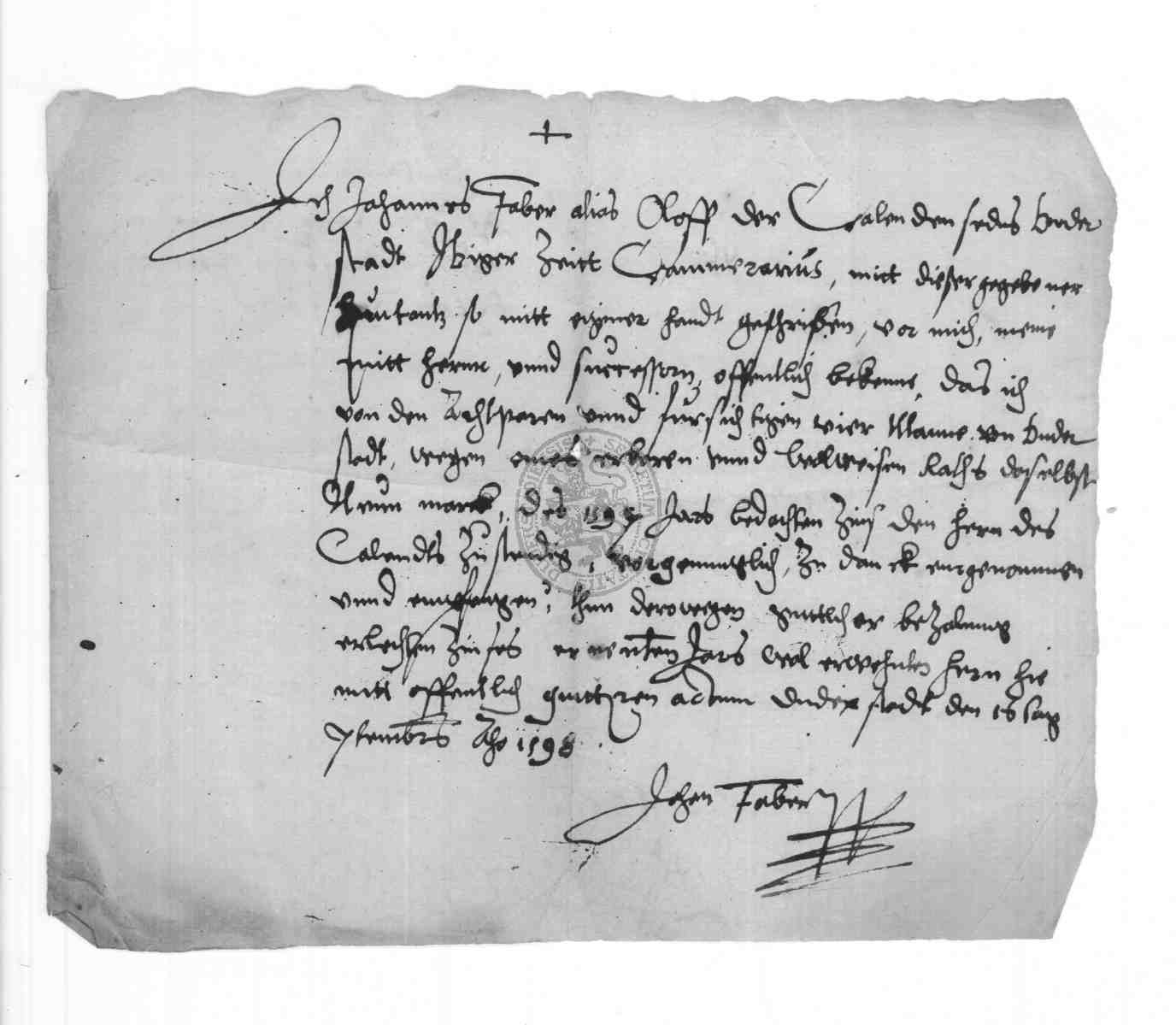| Regest: | Johannes Faber alias Oloff, der Kämmerer des Kalandes zu Duderstadt, quittiert dem Duderstädter Rate über 9 Mark Zins aus dem Jahre 1597 |