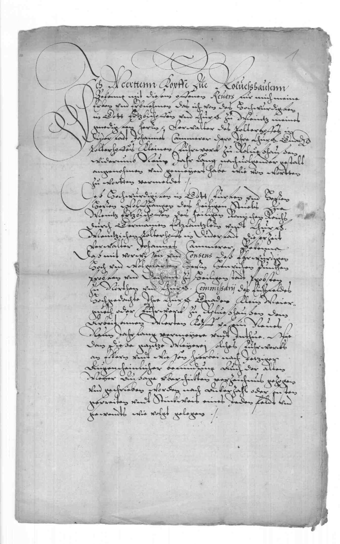 | Regest: | Meierrevers des Merten Kopff zu Rollshausen, in dem er bekennt, daß ihm der Verwalter des Kurfürstlichen Pöhlderhofes in Duderstadt, Johannes Cammerer, im Namen des Erzbischofes Wolffgang zu Mainz mit Vorwissen und Consens des Herrn Henrich Bunthe, Propst und Dechant zu Heiligenstadt, Propst zu Nörthen und Kommissar des Eichsfeldes, das dem Pöhlderhof zuständige kleine Meiergut oder Vorwerk zu Rollshausen wiederum auf 9 Jahre von St. Petri Cathedrae an (= Febr. 22) verpachtet hat. In dem am selben Tage ausgestellten Meierbrief, der transsumiert ist, werden die Ländereien des Vorwerkes, getrennt nach Winter-, Sommerfeld, Brache und Wiesen (Flurnamen und Nachbarn), sowie die Pachtbedingungen angeführt: Merten Kopff hat jährlich zwischen Michaelis und Martini zu liefern 10 Malter Korn, 10 Malter Hafer, Notjahre nicht ausgenommen; außerdem muß er für den Pöhlderhof verschiedene Fuhren leisten etc. Kommt er seinen Verpflichtungen nicht nach, so erlischt der Vertrag, der nach Ablauf der 9 Jahre sowieso kraftlos wird. Als Bürgen stellt er seinen Schwiegervater Hans Müller zu Oberfeld und Kersten Kopff zu Rollshausen. Merten Kopff bittet den Kurfüstlichen Landrichter zu Gieboldehausen, David Fuchs, den Revers von Amts wegen mit seinem Siegel zu bekräftigen |