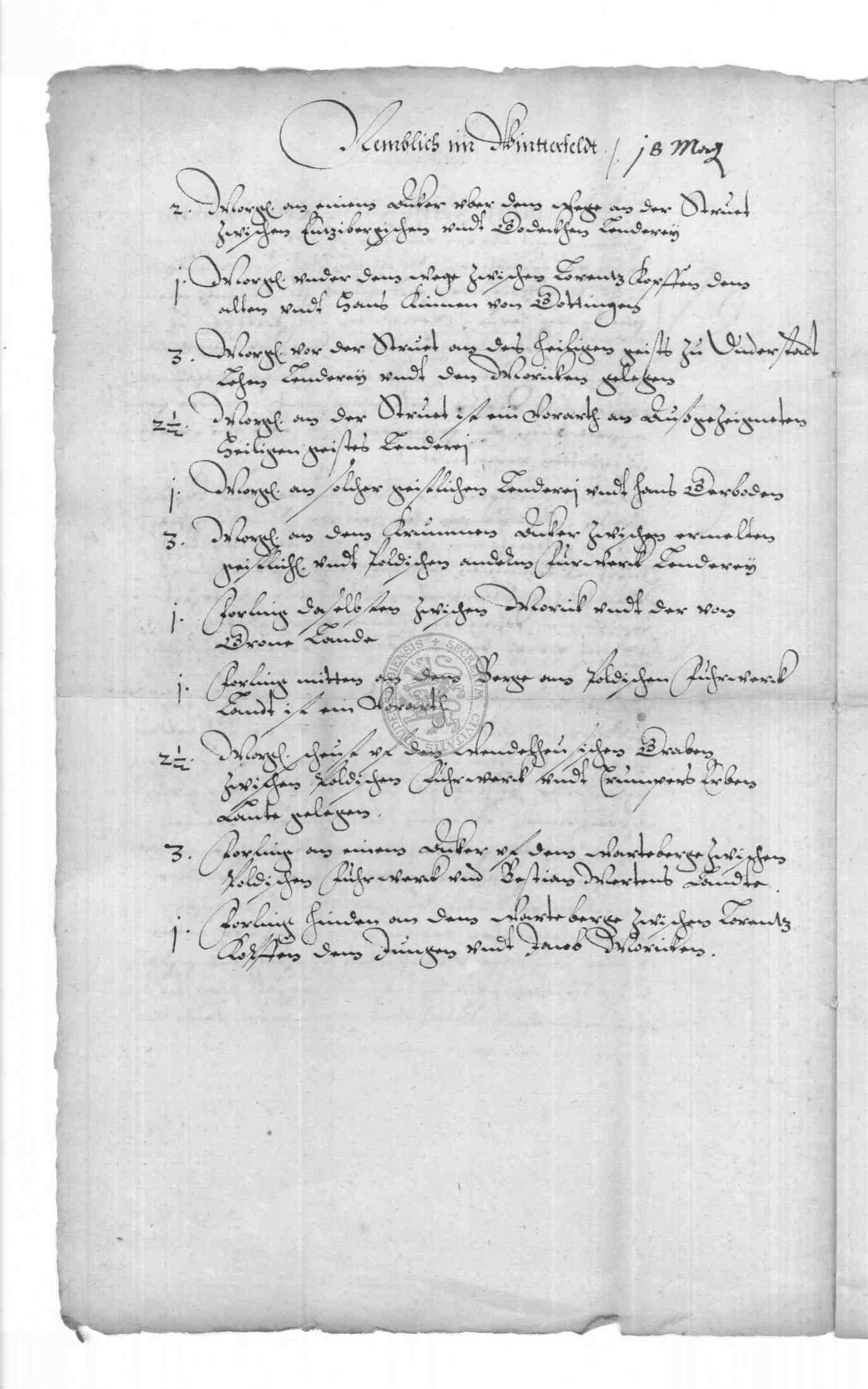 | Regest: | Meierrevers des Merten Kopff zu Rollshausen, in dem er bekennt, daß ihm der Verwalter des Kurfürstlichen Pöhlderhofes in Duderstadt, Johannes Cammerer, im Namen des Erzbischofes Wolffgang zu Mainz mit Vorwissen und Consens des Herrn Henrich Bunthe, Propst und Dechant zu Heiligenstadt, Propst zu Nörthen und Kommissar des Eichsfeldes, das dem Pöhlderhof zuständige kleine Meiergut oder Vorwerk zu Rollshausen wiederum auf 9 Jahre von St. Petri Cathedrae an (= Febr. 22) verpachtet hat. In dem am selben Tage ausgestellten Meierbrief, der transsumiert ist, werden die Ländereien des Vorwerkes, getrennt nach Winter-, Sommerfeld, Brache und Wiesen (Flurnamen und Nachbarn), sowie die Pachtbedingungen angeführt: Merten Kopff hat jährlich zwischen Michaelis und Martini zu liefern 10 Malter Korn, 10 Malter Hafer, Notjahre nicht ausgenommen; außerdem muß er für den Pöhlderhof verschiedene Fuhren leisten etc. Kommt er seinen Verpflichtungen nicht nach, so erlischt der Vertrag, der nach Ablauf der 9 Jahre sowieso kraftlos wird. Als Bürgen stellt er seinen Schwiegervater Hans Müller zu Oberfeld und Kersten Kopff zu Rollshausen. Merten Kopff bittet den Kurfüstlichen Landrichter zu Gieboldehausen, David Fuchs, den Revers von Amts wegen mit seinem Siegel zu bekräftigen |