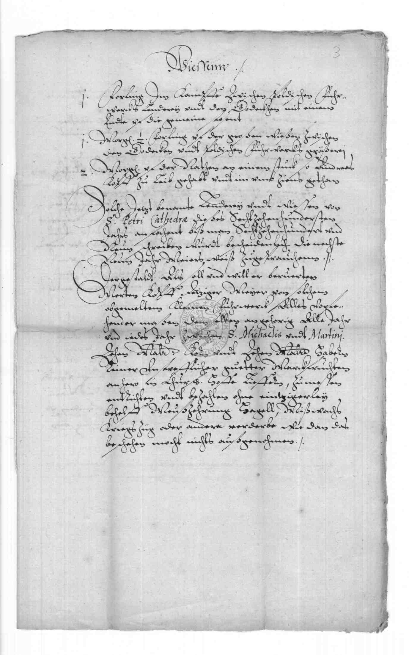 | Regest: | Meierrevers des Merten Kopff zu Rollshausen, in dem er bekennt, daß ihm der Verwalter des Kurfürstlichen Pöhlderhofes in Duderstadt, Johannes Cammerer, im Namen des Erzbischofes Wolffgang zu Mainz mit Vorwissen und Consens des Herrn Henrich Bunthe, Propst und Dechant zu Heiligenstadt, Propst zu Nörthen und Kommissar des Eichsfeldes, das dem Pöhlderhof zuständige kleine Meiergut oder Vorwerk zu Rollshausen wiederum auf 9 Jahre von St. Petri Cathedrae an (= Febr. 22) verpachtet hat. In dem am selben Tage ausgestellten Meierbrief, der transsumiert ist, werden die Ländereien des Vorwerkes, getrennt nach Winter-, Sommerfeld, Brache und Wiesen (Flurnamen und Nachbarn), sowie die Pachtbedingungen angeführt: Merten Kopff hat jährlich zwischen Michaelis und Martini zu liefern 10 Malter Korn, 10 Malter Hafer, Notjahre nicht ausgenommen; außerdem muß er für den Pöhlderhof verschiedene Fuhren leisten etc. Kommt er seinen Verpflichtungen nicht nach, so erlischt der Vertrag, der nach Ablauf der 9 Jahre sowieso kraftlos wird. Als Bürgen stellt er seinen Schwiegervater Hans Müller zu Oberfeld und Kersten Kopff zu Rollshausen. Merten Kopff bittet den Kurfüstlichen Landrichter zu Gieboldehausen, David Fuchs, den Revers von Amts wegen mit seinem Siegel zu bekräftigen |