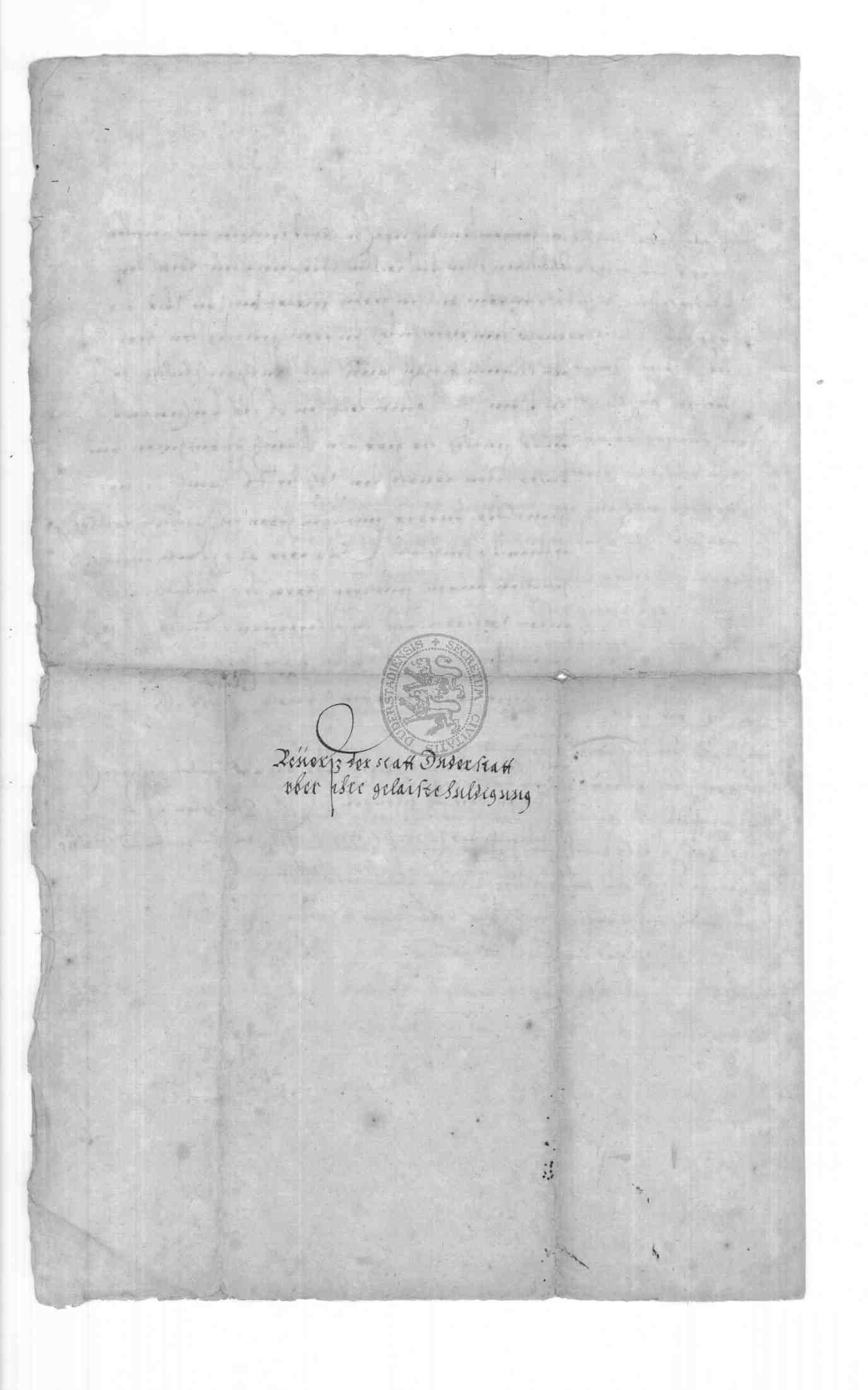 | Regest: | Die Stadt Duderstadt huldigt dem Kurfürsten zu Mainz, Johann Schweickardt. Sie verspricht eidlich dessen Stellvertretern, dem Vicedom und Hofrichter zu Mainz, Hans Reichardt Brombßern von Rudesheim, und dem Amtmann zu Fritzlar und Naumburg, Friederich von Fürstenberg, stets dem Kurfürsten getreu, hold und gehorsam zu sein. Ferner gelobt die Stadt den beiden Mainzer Domdechanten Jacob von Eltz und Adam von Rechenbach, falls der Kurfürst in Gefangenschaft geraten, mit dem Tode abgehen oder ohne Einwilligung des Domkapitels Befehle erteilen würde, die Herren des Domstiftes als ihre Erbherrn anzusehen, bis "solche Irrung hingelegt und vertragen würde" |
