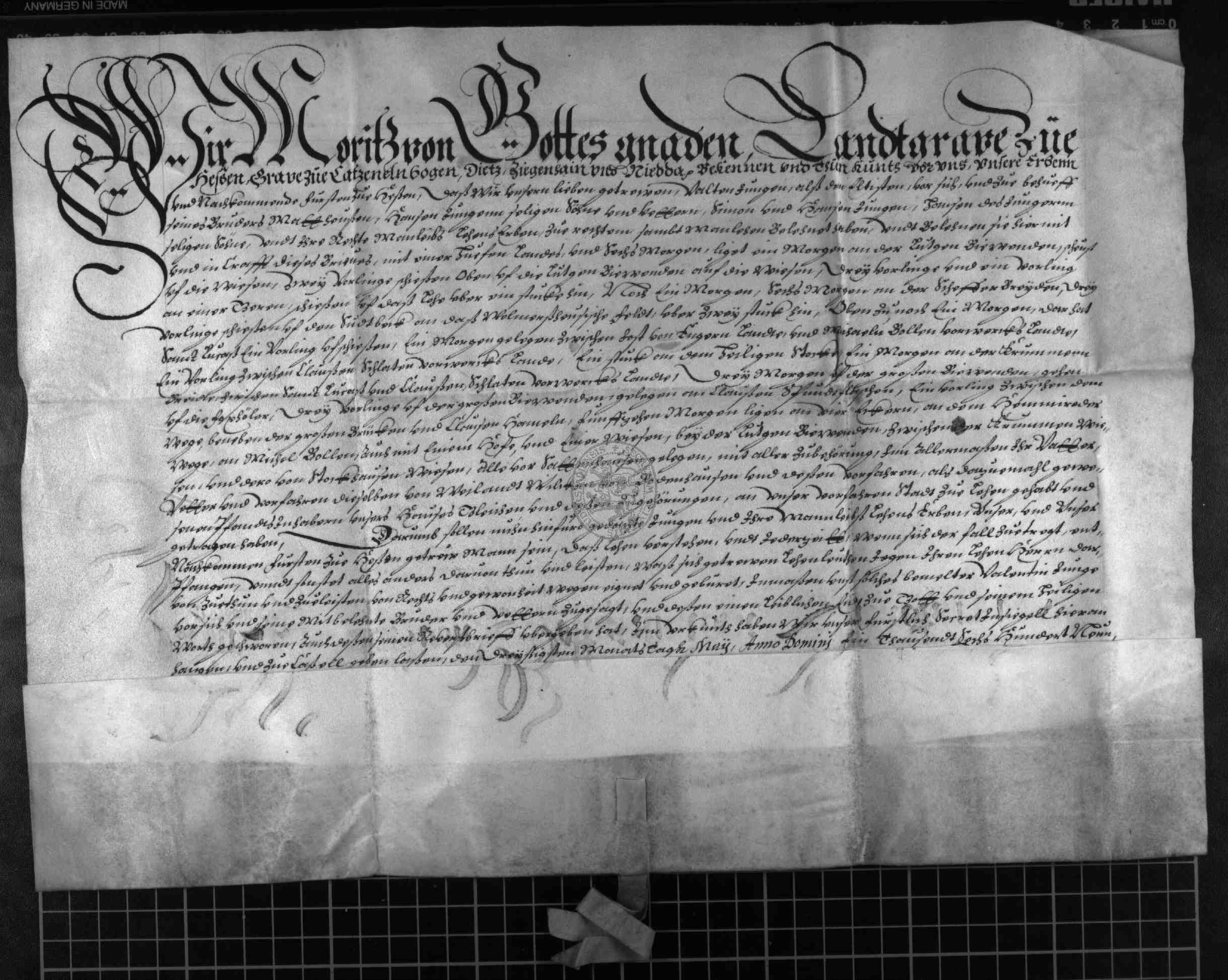| Regest: | Landgraf Moritz von Hessen etc. belehnt Valten Jungen als ältesten der Junge mit einer Hufe Landes und 6 Morgen, gelegen bei dem Dorfe Sattenhausen, wie sie vorher ihr Vater und vor diesem Wilke von Bodenhausen inne gehabt haben |