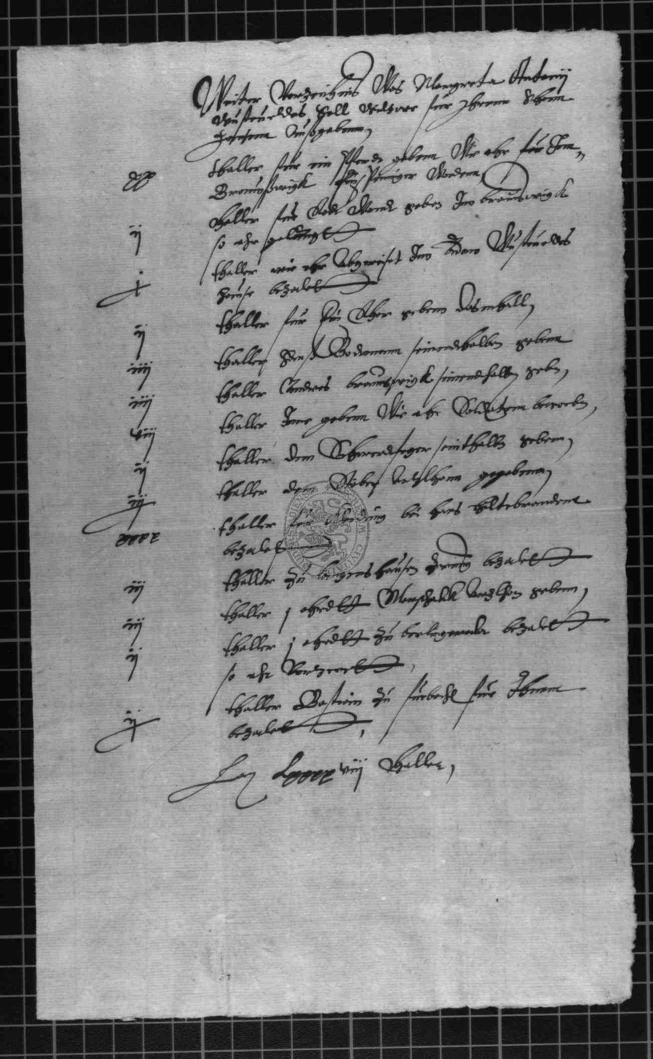 | Regest: | Letztwillige Verfügung der Duderstädter Bürgerin Margarethe, Anton Wüstefelds Witwe. Frau Margaretha, Anthonii Wüstefelds, gewesenen Bürgers zu Duderstadt, hinterlassene Witwe, errichtet vor dem in Rolveshausen wohnhaften Notar Jacobus Große, Gerichtsschreiber der Ämter Gieboldehausen und Lindau, in Gegenwart mehrerer Zeugen ihr Testament. Sie vermacht darin, da ihr ungeratener Sohn Hans, obwohl er von seinem Paten und Vetter Hans Hiltebranden und Adam Wüstevelden mehrfach ermahnt wurde, sein lockeres, verschwenderisches Leben fortgesetzt und auch nach seiner Rückkehr von Braunschweig seine Mutter mißachtet und sogar geschlagen hat, ihrer Tochter Catharina das zwischen Hans Hildebrand und relicta Jacob Rudolffs Sell gelegene Haus mit aller Substanz und herbringlicher Gerechtigkeit im Werte von 486 Talern. Dem Sohn sollen die laut beiligenden Zettels von der Mutter bezahlten Schulden auf sein Erbe angerechnet werden; hinsichtlich des übrigen Besitzes, Gärten, Hausrat etc. sollen sich ihre beiden Kinder gütlich einigen. Für das, was die Tochter an Kleidung und Bettzeug bereits bekommen hat, soll sie ihrem Bruder 16 Taler für ein neues Kleid herausgeben. Wenn der Sohn das Testament anficht, soll er auch obiger Donation verlustig gehen. Zeugen: Die beiden Schultheißen Michel Kries und Henrich Windolff; Lorentz, Bartolmes und Bastian Alex, Henrich Hosen, Hans Rudolff, sämtlich zu Rollshausen |