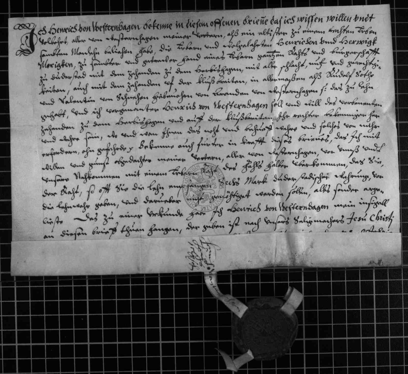 | Regest: | Henrich von Westernhagen belehnt die Stadt Duderstadt mit dem Zehnten zum Herbigshagen und auf der Klusbreiten. Lehnsträger für die Stadt sind Henrich und Herwigk Morigk |