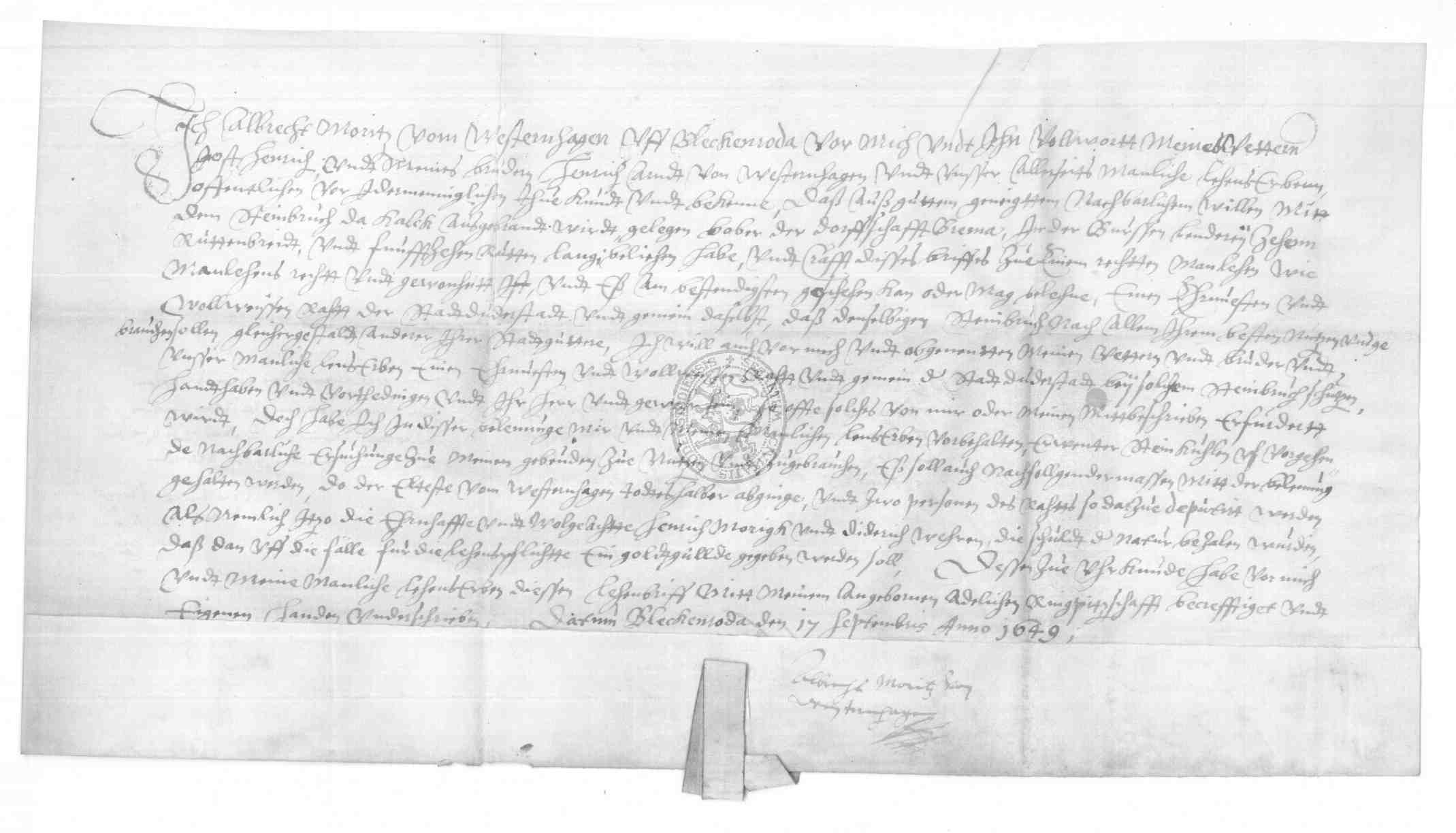 | Regest: | Albrecht Moritz vom Westernhagen auf Bleckenrode belehnt zugleich im Namen seines Vetters Jost Henrich und seines Bruders Henrich Arndt vom Westernhagen die Stadt Duderstadt mit dem Steinbruche oberhalb des Dorfes Brehme in der "Burssen lenderey". Treuhänder für den Rat: Henrich Morigk und Diderich Wehren |