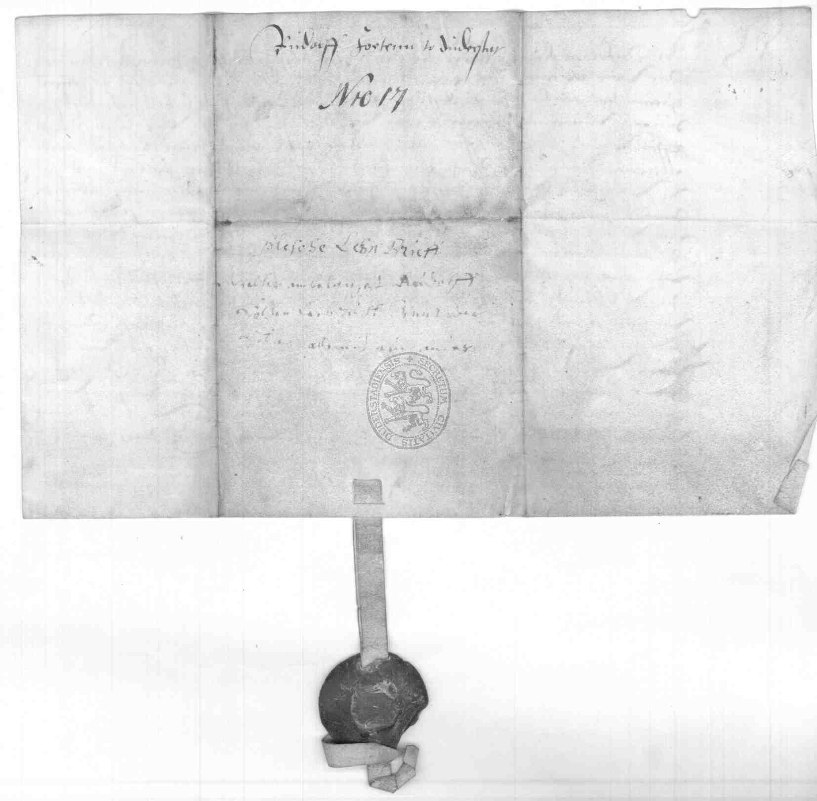 | Regest: | Diederich der Ältere, Herr zu Plesse, belehnt Rudolff Zoeten, Bürger zu Duderstadt, mit einem Vorwerke von 5 Hufen Landes und 2 Sedelhöfen und 2 Kothöfen im Dorfe und Flur zu Sulingen, wie solches sein Bruder Henrich und ihr Vater zuvor zu Lehen gehabt haben. Auch belehnt Diederich von Plesse auf Bitten Rudolffs und seiner Freunde Rudolffs Schwester Margarete mit einer Leibzucht an diesem Vorwerk etc., wie ihre Mutter und ihre Schwester Anna sie vorher gehabt haben |